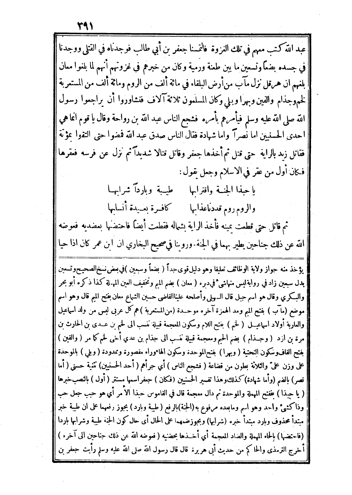 ثم قاتل حتى قطعت يمينه فأخذ الراية بشماله فقطعت أيضا فاحتضنها بعضديه فعوضه الله عن ذلك جناحين يطير بهما في الجنة. وروينا في صحيح البخاري ان ابن عمر كان اذا حيا يؤخذ منه جواز ولاية الوظائف تعليقا وهو دليل قوى جدا (بضعا وسبعين) في بعض نسخ الصحيح وتسعين بدل سبعين زاد في رواية ليس منها شىء في دبره (معان) بضم الميم وتخفيف العين المهملة كذا ذكره أبو بحر والبكري وقال هو اسم جبل قال السهيلى وأصلحه علينا القاضى حسين الشماع معان بفتح الميم قال وهو اسم موضع (مآب) بفتح الميم ومد الهمزة آخره موحدة (من المستعربة) هم كل عربى ليس من ولد اسماعيل والعاربة أولاد اسماعيل (لخم) بفتح اللام وسكون المعجمة قبيلة تنسب الى لخم بن عدى بن الحارث بن مرة بن ازد (وجذام) بضم الجيم ومعجمة قبيلة تنسب الى جذام بن عدي أخى لخم كما مر (والقين) بفتح القاف وسكون التحتية (وبهرا) بفتح الموحدة وسكون الهاء وراء مقصورة وممدودة (وبلي) بالموحدة على وزن علىّ والثلاثة بطون من قضاعة (فشجع الناس) أي جرأهم (أحد الحسنيين) تثنية حسنى (أما نصر) بالضم (وأما شهادة) كذلك وهذا تفسير الحسنيين (فكان) جعفر اسمها مستتر (أول) بالنصب خبرها (يا حبذا) بففتح المهملة والموحدة ثم دال معجمة قال في القاموس حبذا الأمر أي هو حبب جعل حب وذا كشئ واحد وهو اسم وما بعده مرفوع به (الجنة) بالرفع (طيبة وبارد) يجوز رفعهما على ان طيبة خبر مبتدأ محذوف وبارد مبتدأ خبره (شرابها) ويجوز ضمهما على الحال أى حال كون الجنة طيبة وشرابها باردا (فاحتضها) بالحاء المهملة والضاد المعجمة أي أخذها بحضنيه (فعوضه الله عن ذلك جناحين الى آخره) أخرج الترمذي والحاكم من حديث أبى هريرة قال قال رسول الله صلى الله عليه وسلم رأيت جعفر بن