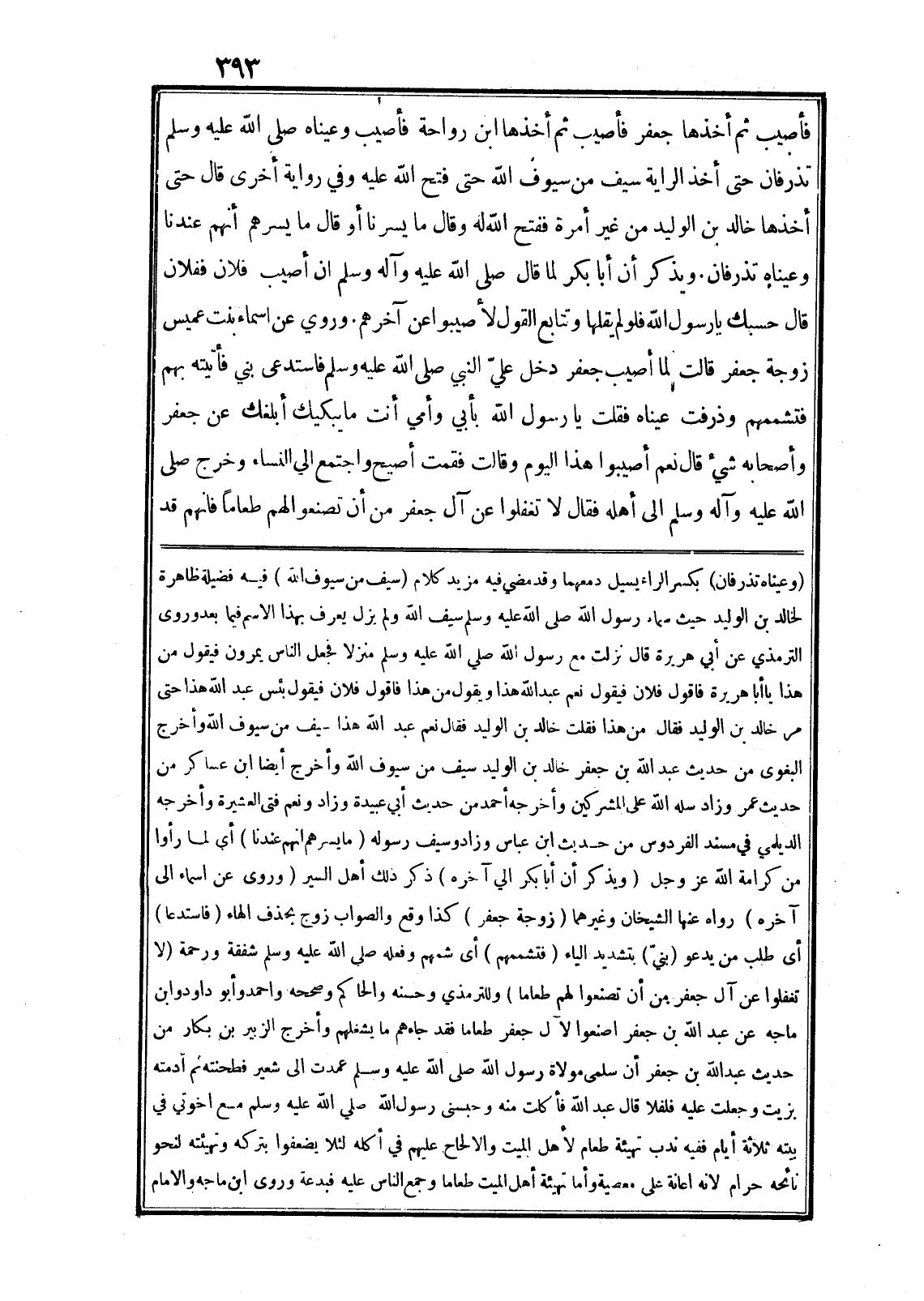 فأصيب ثم أخذها جعفر فأصيب ثم أخذها ابن رواحة فأصيب وعيناه صلى الله عليه وسلم تذرفان حتى أخذ الراية سيف من سيوف الله حتى فتح الله عليه وفي رواية أخرى قال حتى أخذها خالد بن الوليد من غير أمرة ففتح الله له وقال ما يسرنا أو قال ما يسرهم أنهم عندنا وعيناه تذرفان. ويذكر أن أبا بكر لما قال صلى الله عليه وآله وسلم ان أصيب فلان ففلان قال حسبك يا رسول الله فلولم يقلها وتتابع القول لأصيبوا عن آخرهم. وروي عن اسماء بنت عميس زوجة جعفر قالت لما أصيب جعفر دخل عليّ النبي صلى الله عليه وسلم فاستدعى بني فأتيته بهم فتشممهم وذرفت عيناه فقلت يا رسول الله بأبي وأمي أنت ما يبكيك أبلغك عن جعفر وأصحابه شيء قال نعم أصيبوا هذا اليوم وقالت فقمت أصيح واجتمع الى النساء وخرج صلى الله عليه وآله وسلم الى أهله فقال لا تغفلوا عن آل جعفر من أن تصنعوا لهم طعاما فانهم قد (وعيناه تذرفان) بكسر الراء يسيل دمعهما وقد مضي فيه مزيد كلام (سيف من سيوف الله) فيه فضيلة ظاهرة لخالد بن الوليد حيث سماه رسول الله صلى الله عليه وسلم سيف الله ولم يزل يعرف بهذا الاسم فيما بعد وروى الترمذي عن أبي هريرة قال نزلت مع رسول الله صلى الله عليه وسلم منزلا فجعل الناس يمرون فيقول من هذا يا أبا هريرة فاقول فلان فيقول نعم عبد الله هذا ويقول من هذا فاقول فلان فيقول بئس عبد الله هذا حتى مر خالد بن الوليد فقال من هذا فقلت خالد بن الوليد فقال نعم عبد الله هذا سيف من سيوف الله وأخرج البغوى من حديث عبد الله بن جعفر خالد بن الوليد سيف من سيوف الله وأخرج أيضا ابن عساكر من حديث عمر وزاد سله الله على المشركين وأخرجه أحمد من حديث أبي عبيدة وزاد ونعم فتى العشيرة وأخرجه الديلمي في مسند الفردوس من حديث ابن عباس وزاد وسيف رسوله (ما يسرهم انهم عندنا) أي لما رأوا من كرامة الله عز وجل (ويذكر أن أبا بكر إلى آخره) ذكر ذلك أهل السير (وروى عن اسماء الى آخره) رواه عنها الشيخان وغيرهما (زوجة جعفر) كذا وقع والصواب زوج بحذف الهاء (فاستدعا) أى طلب من يدعو (بنيّ) بتشديد الياء (فتشممهم) أى شمهم وفعله صلى الله عليه وسلم شفقة ورحمة (لا تغفلوا عن آل جعفر من أن تصنعوا لهم طعاما) وللترمذي وحسنه والحاكم وصححه واحمد وأبو داود وابن ماجه عن عبد الله بن جعفر اصنعوا لآل جعفر طعاما فقد جاءهم ما يشغلهم وأخرج الزبير بن بكار من حديث عبد الله بن جعفر أن سلمى مولاة رسول الله صلى الله عليه وسلم عمدت الى شعير فطحنته ثم آدمته بزيت وجعلت عليه فلفلا قال عبد الله فأكلت منه وحبسنى رسول الله صلى الله عليه وسلم مع اخوتي في بيته ثلاثة أيام ففيه ندب تهيئة طعام لأهل الميت والالحاح عليهم في أكله لئلا يضعفوا بتركه وتهيئته لنحو نائحه حرام لانه اعانة على معصية وأما تهيئة أهل الميت طعاما وجمع الناس عليه فبدعة وروى ابن ماجه والامام