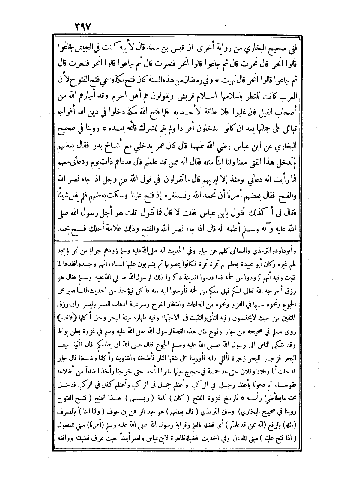 وفي رمضان من هذه السنة كان فتح مكة وسمي فتح الفتوح لأن العرب كانت تنتظر باسلامها اسلام قريش ويقولون هم أهل الحرم وقد أجارهم الله من أصحاب الفيل فان غلبوا فلا طاقة لأحد به فلما فتح الله مكة دخلوا في دين الله أفواجا قبائل على جملتها بعد ان كانوا يدخلون أفرادا ولم يقم للشرك قائمة بعده* روينا في صحيح البخاري عن ابن عباس رضي الله عنهما قال كان عمر يدخلني مع أشياخ بدر فقال بعضهم لم تدخل هذا الفتى معنا ولنا ابنا مثله فقال انه ممن قد علمتم قال فدعاهم ذات يوم ودعانى معهم فما رأيت انه دعاني يومئذ إلا ليريهم قال ما تقولون في قول الله عز وجل إِذا جاءَ نَصْرُ اللَّهِ وَالْفَتْحُ فقال بعضهم أمرنا أن نحمد الله ونستغفره إذ فتح علينا وسكت بعضهم فلم يقل شيئا فقال لى أكذلك تقول يابن عباس فقلت لا قال فما تقول قلت هو أجل رسول الله صلى الله عليه وآله وسلم أعلمه له قال اذا جاء نصر الله والفتح وذلك علامة أجلك فسبح بحمد وأبو داود والترمذي والنسائي كلهم عن جابر وفي الحديث انه صلى الله عليه وسلم زودهم جرابا من تمر لم يجد لهم غيره وكان أبو عبيدة يعطيهم تمرة تمرة فكانوا يمصونها ثم يشربون عليها الماء وانهم وجدوا فقدها لما فنيت وفيه أنهم تزودوا من لحمه فلما قدموا المدينة ذكروا ذلك لرسول الله صلى الله عليه وسلم فقال هو رزق أخرجه الله تعالى لكم فهل معكم من لحمه فأرسلوا اليه منه فأكل فيؤخذ من الحديث طلب الصبر على الجوع ونحوه سيما في الغزو ونحوه من الطاعات وانتظار الفرج وسرعة اذهاب العسر باليسر وان رزق المتقين من حيث لا يحتسبون وفيه التأنى والتثبت في الاجتهاد وفيه طهارة ميتة البحر وحل أكلها (فائدة) روى مسلم في صحيحه عن جابر وقوع مثل هذه القصة لرسول الله صلى الله عليه وسلم في غزوة بطن بواط وقد شكى الناس الى رسول الله صلى الله عليه وسلم الجوع فقال عسى الله ان يطعمكم قال فأتينا سيف البحر فزجر البحر زجرة فألقي دابة فأورينا على شقها النار فأطبخنا واشتوينا وأكلنا وشبعنا قال جابر فدخلت أنا وفلان وفلان حتى عد خمسة في حجاج عينها ما يرانا أحد حتى خرجنا وأخذنا ضلعا من أضلاعه فقوسناه ثم دعونا بأعظم رجل في الركب وأعظم جمل في الركب وأعظم كفل في الركب فدخل تحته ما يطأطيء رأسه* تاريخ غزوة الفتح (كان) تامة (ويسمى) هذا الفتح (فتح الفتوح روينا في صحيح البخاري) وسنن الترمذي (قال بعضهم) هو عبد الرحمن بن عوف (ولنا ابنا) بالصرف (مثله) بالرفع (انه ممن قد علمتم) أي فضله بالعلم وقرابة رسول الله صلى الله عليه وسلم (أمرنا) مبني للمفعول (اذا فتح علينا) مبنى للفاعل وفي الحديث فضيلة ظاهرة لابن عباس ولعمر أيضا حيث عرف فضيلته ووافقه