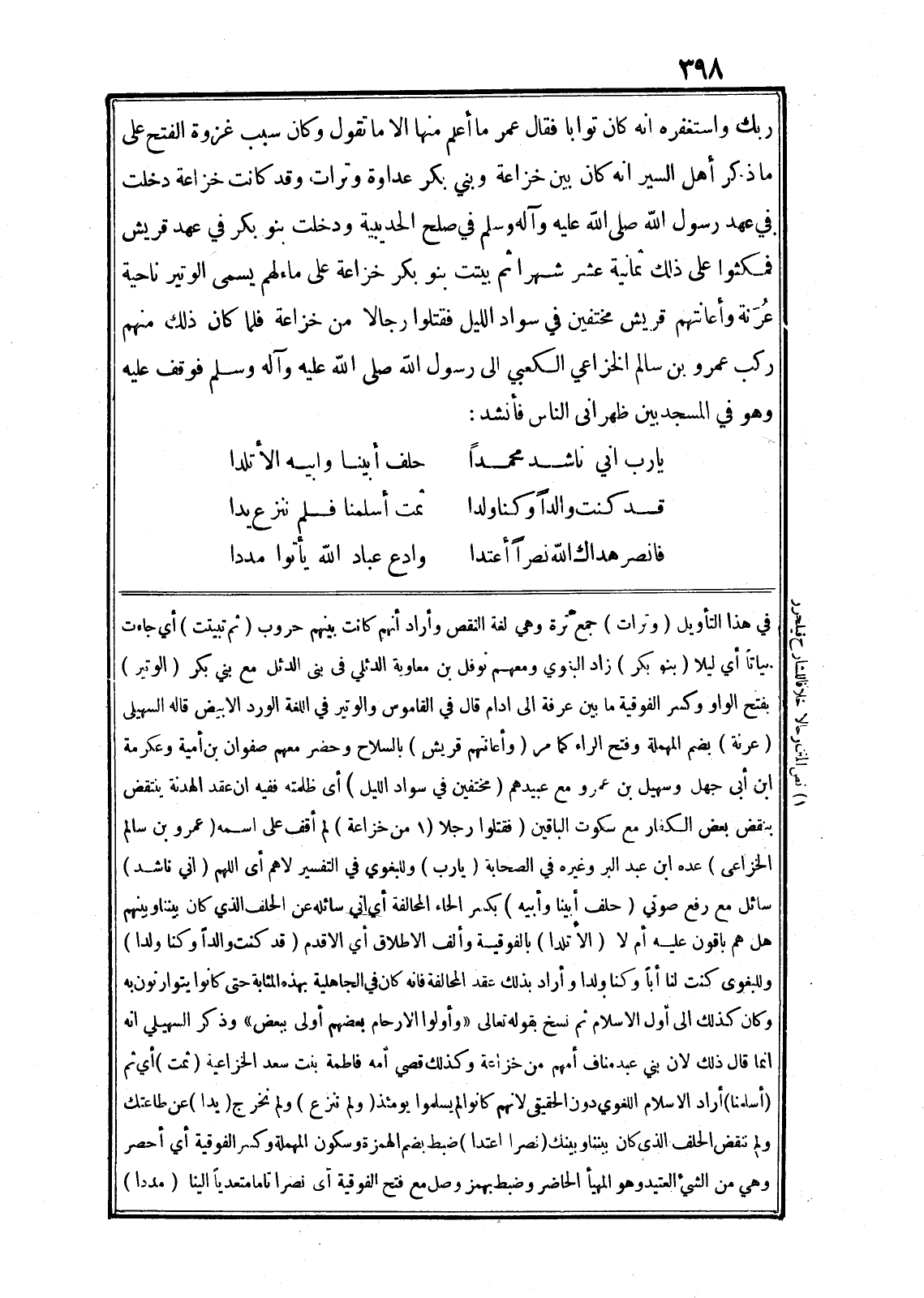 في هذا التأويل (وترات) جمع ترة وهي لغة النقص وأراد أنهم كانت بينهم حروب (ثم تبيتت) أي جاءت بياتا أي ليلا (بنو بكر) زاد البغوي ومعهم نوفل بن معاوية الدئلي في بنى الدئل مع بني بكر (الوتير) بفتح الواو وكسر الفوقية ما بين عرفة الى ادام قال في القاموس والوتير في اللغة الورد الابيض قاله السهيلى (عرنة) بضم المهملة وفتح الراء كما مر (وأعانتهم قريش) بالسلاح وحضر معهم صفوان بن أمية وعكرمة ابن أبى جهل وسهيل بن عمرو مع عبيدهم (مختفين في سواد الليل) أى ظلمته ففيه ان عقد الهدنة ينتقض بنقض بعض الكفار مع سكوت الباقين (فقتلوا رجلا «1» من خزاعة) لم أقف على اسمه (عمرو بن سالم الخزاعى) عده ابن عبد البر وغيره في الصحابة (يا رب) وللبغوي في التفسير لاهم أى اللهم (اني ناشد) سائل مع رفع صوتي (حلف أبينا وأبيه) بكسر الحاء المحالفة أي اني سائله عن الحلف الذي كان بيننا وبينهم هل هم باقون عليه أم لا (الأتلدا) بالفوقية وألف الاطلاق أي الاقدم (قد كنت والدا وكنا ولدا) وللبغوى كنت لنا أبا وكنا ولدا وأراد بذلك عقد المحالفة فانه كان في الجاهلية بهذه المثابة حتى كانوا يتوارثون به وكان كذلك الى أوّل الاسلام ثم نسخ بقوله تعالى «وَأُولُوا الْأَرْحامِ بَعْضُهُمْ أَوْلى بِبَعْضٍ» وذكر السهيلي انه انما قال ذلك لان بني عبد مناف أمهم من خزاعة وكذلك قصي أمه فاطمة بنت سعد الخزاعية (ثمت) أي ثم (أسلمنا) أراد الاسلام اللغوي دون الحقيقى لانهم كانوا لم يسلموا يومئذ (ولم ننزع) ولم نخرج (يدا) عن طاعتك ولم تنقض الحلف الذى كان بيننا وبينك (نصرا اعتدا) ضبط بضم الهمزة وسكون المهملة وكسر الفوقية أي أحصر وهي من الشيء العتيد وهو المهيأ الحاضر وضبط بهمز وصل مع فتح الفوقية أى نصرا تاما متعديا الينا (مددا)