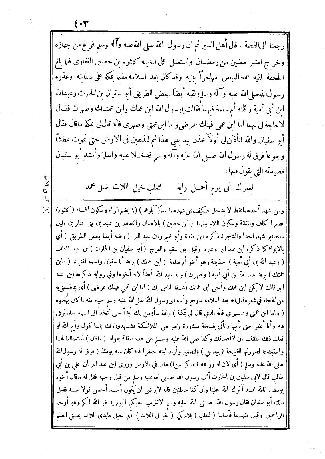 ومن شهد أحدهما فقط لا يدخل فكيف بمن شهدهما معا (ابارهم) «1» بضم الراء وسكون الهاء (كلثوم) بضم الكاف والمثلثة وسكون اللام بينهما (ابن حصين) بالاهمال والتصغير بن عبيد بن بني غفار بن مليل بالتصغير شهد احدا والشجرة ذكره ابن مندة وأبو نعيم وابن عبد البر (ولقيه أيضا بعض الطريق) أي بالابواء كما ذكره ابن عبد البر وغيره وقيل بين سقيا والعرج (أبو سفيان بن الحارث) بن عبد المطلب (وعبد الله بن أبي أمية) حذيفة وهو أخو أم سلمة (ابن عمك) يريد أبا سفيان واسمه المغيرة (وابن عمتك) يريد عبد الله بن أبي أمية (وصهرك) يريد عبد الله أيضا لانه أخوها وفي رواية ذكرها ابن عبد البر قالت لا يكن ابن عمك وأخى ابن عمتك أشقا الناس بك (اما ابن عمي فهتك عرضي) أي بما ينسبني به من الهجاء في شعره قيل انه بعد اسلامه ما رفع رأسه الى رسول الله صلى الله عليه وسلم حياء منه لما كان يهجوه (واما ابن عمتي وصهري فانه الذي قال لى بمكة) والله ما أومن بك أبدا حتى تتخذ الى السماء سلما ترقى فيه وأنا أنظر حتى تأتيها وتأتي بنسخة منشورة ونفر من الملائكة يشهدون لك بما تقول وأيم الله لو فعلت ذلك لظننت ان لا أصدقك وكفا صلى الله عليه وسلم عن هذه المقالة بقوله (ما قال) استعظاما لها واستبشاعا لصورتها القبيحة (بيد بني) بالتصغير وأراد ابنه جعفرا فانه كان معه يومئذ (فرق له رسول الله صلى الله عليه وسلم) أي لان له ورحمه لما ذكر من الذهاب في الارض وروى ابن عبد البران علي بن أبي طالب قال لابي سفيان بن الحارث أئت رسول الله صلى الله عليه وسلم من قبل وجهه فقل له ما قال أخوه يوسف تالله لقد آثرك الله علينا وان كنا لخاطئين فانه لا يرضى ان يكون أحد أحسن قولا منه ففعل ذلك أبو سفيان فقال رسول الله صلى الله عليه وسلم لا تثريب عليكم اليوم يغفر الله لكم وهو أرحم الراحمين وقبل منهما فأسلما (لتغلب) بلام كي (خيل اللات) أي خيل عابدى اللات يعني الصنم