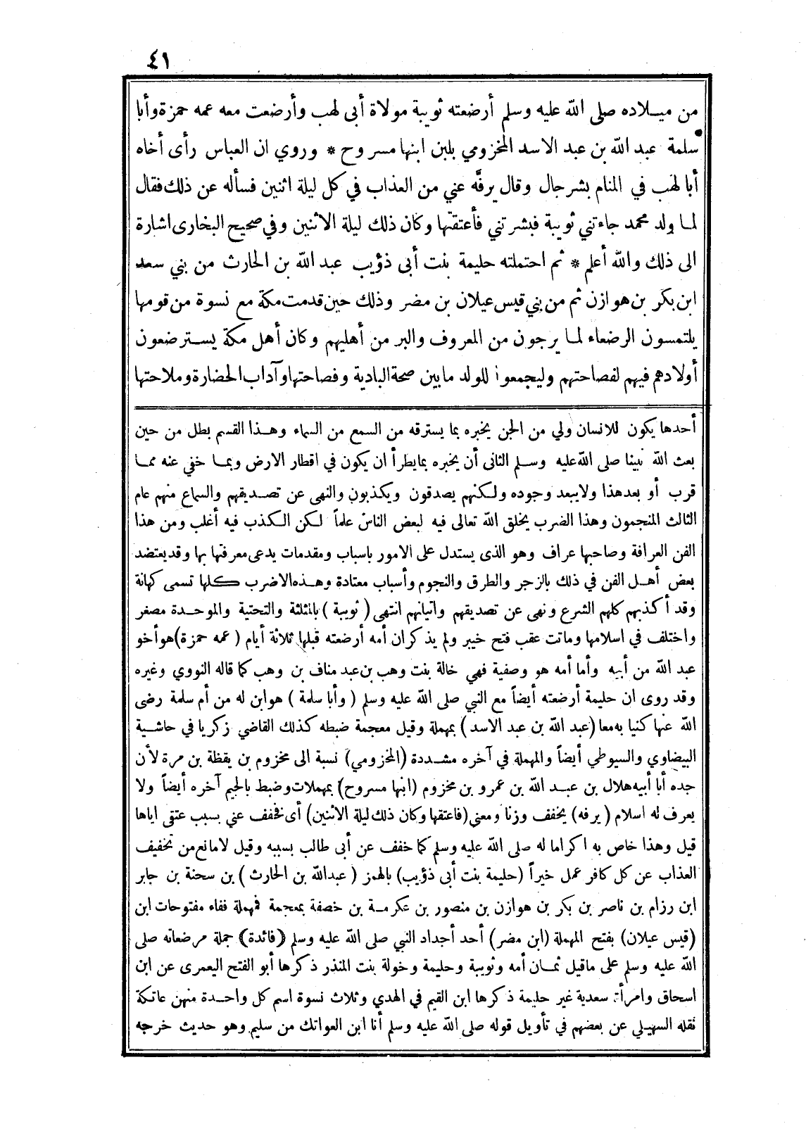 من ميلاده صلى الله عليه وسلم أرضعته ثويبة مولاة أبى لهب وأرضعت معه عمه حمزة وأبا سلمة عبد الله بن عبد الاسد المخزومي بلبن ابنها مسروح* وروي ان العباس رأى أخاه أبا لهب في المنام بشرجال وقال يرفّه عني من العذاب في كل ليلة اثنين فسأله عن ذلك فقال لما ولد محمد جاءتني ثويبة فبشرتني فأعتقتها وكان ذلك ليلة الاثنين وفي صحيح البخارى اشارة الى ذلك والله أعلم* ثم احتملته حليمة بنت أبى ذؤيب عبد الله بن الحارث من بني سعد ابن بكر بن هوازن ثم من بني قيس عيلان بن مضر وذلك حين قدمت مكة مع نسوة من قومها يلتمسون الرضعاء لما يرجون من المعروف والبر من أهليهم وكان أهل مكة يسترضعون أولادهم فيهم لفصاحتهم وليجمعوا للولد ما بين صحة البادية وفصاحتها وآداب الحضارة وملاحتها أحدها يكون للانسان ولي من الجن يخبره بما يسترقه من السمع من السماء وهذا القسم بطل من حين بعث الله نبينا صلى الله عليه وسلم الثاني أن يخبره بما يطرأ ان يكون في اقطار الارض وبما خفي عنه مما قرب أو بعد هذا ولا يبعد وجوده ولكنهم يصدقون ويكذبون والنهى عن تصديقهم والسماع منهم عام الثالث المنجمون وهذا الضرب يخلق الله تعالى فيه لبعض الناس علما لكن الكذب فيه أغلب ومن هذا الفن العرافة وصاحبها عراف وهو الذي يستدل على الامور باسباب ومقدمات يدعى معرفتها بها وقد يعتضد بعض أهل الفن في ذلك بالزجر والطرق والنجوم وأسباب معتادة وهذه الاضرب كلها تسمى كهانة وقد أكذبهم كلهم الشرع ونهى عن تصديقهم واتيانهم انتهى (ثويبة) بالمثلثة والتحتية والموحدة مصغر واختلف في اسلامها وماتت عقب فتح خيبر ولم يذكران أمه أرضعته قبلها ثلاثة أيام (عمه حمزة) هو أخو عبد الله من أبيه وأما أمه هو وصفية فهي خالة بنت وهب بن عبد مناف بن وهب كما قاله النووي وغيره وقد روى ان حليمة أرضعته أيضا مع النبي صلى الله عليه وسلم (وأبا سلمة) هو ابن له من أم سلمة رضى الله عنها كنيا به معا (عبد الله بن عبد الاسد) بمهملة وقيل معجمة ضبطه كذلك القاضي زكريا في حاشية البيضاوي والسيوطي أيضا والمهملة في آخره مشددة (المخزومي) نسبة الى مخزوم بن يقظة بن مرة لأن جده أبا أبيه هلال بن عبد الله بن عمرو بن مخزوم (ابنها مسروح) بمهملات وضبط بالجيم آخره أيضا ولا يعرف له اسلام (يرفه) يخفف وزنا ومعنى (فاعتقها وكان ذلك ليلة الاثنين) أى فخفف عني بسبب عتقى اياها قيل وهذا خاص به اكراما له صلى الله عليه وسلم كما خفف عن أبى طالب بسببه وقيل لا مانع من تخفيف العذاب عن كل كافر عمل خيرا (حليمة بنت أبى ذؤيب) بالهمز (عبد الله بن الحارث) بن سحنة بن جابر ابن رزام بن ناصر بن بكر بن هوازن بن منصور بن عكرمة بن خصفة بمعجمة فمهملة ففاء مفتوحات ابن (قيس عيلان) بفتح المهملة (ابن مضر) أحد أجداد النبي صلى الله عليه وسلم (فائدة) جملة مرضعاته صلى الله عليه وسلم على ما قيل ثمان أمه وثويبة وحليمة وخولة بنت المنذر ذكرها أبو الفتح اليعمرى عن ابن اسحاق وامرأة سعدية غير حليمة ذكرها ابن القيم في الهدي وثلاث نسوة اسم كل واحدة منهن عاتكة نقله السهيلي عن بعضهم في تأويل قوله صلى الله عليه وسلم أنا ابن العواتك من سليم وهو حديث خرجه