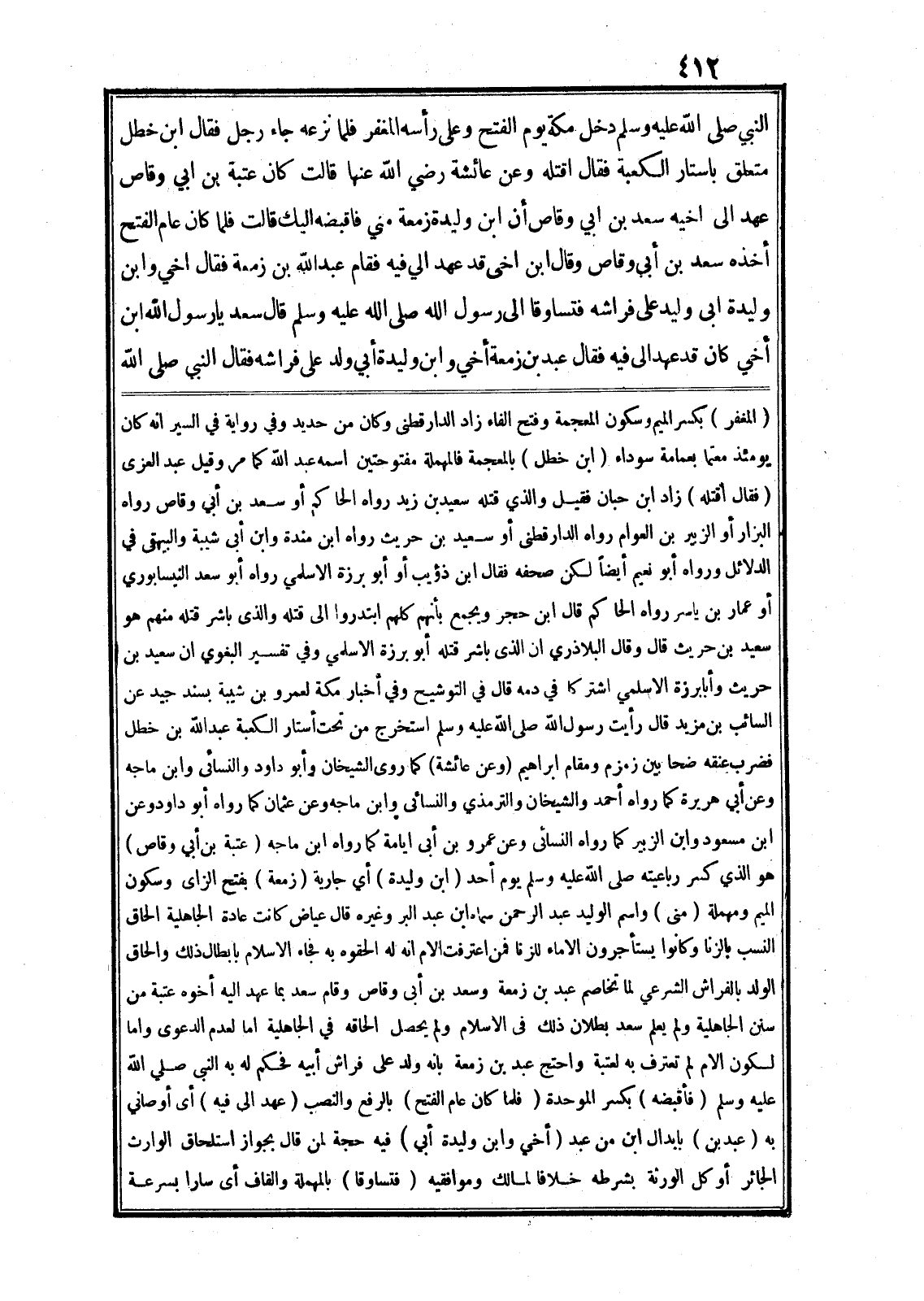 وعن عائشة رضي الله عنها قالت كان عتبة بن ابي وقاص عهد الى اخيه سعد بن ابي وقاص أن ابن وليدة زمعة مني فاقبضه اليك قالت فلما كان عام الفتح أخذه سعد بن أبي وقاص وقال ابن اخى قد عهد الي فيه فقام عبد الله بن زمعة فقال اخي وابن وليدة ابى وليد على فراشه فتساوقا الى رسول الله صلى الله عليه وسلم قال سعد يا رسول الله ابن أخي كان قد عهد الى فيه فقال عبد بن زمعة أخي وابن وليدة أبي ولد على فراشه فقال النبي صلى الله (المغفر) بكسر الميم وسكون المعجمة وفتح الفاء زاد الدار قطنى وكان من حديد وفي رواية في السير انه كان يومئذ معتما بعمامة سوداء (ابن خطل) بالمعجمة فالمهملة مفتوحتين اسمه عبد الله كما مر وقيل عبد العزى (فقال أقتله) زاد ابن حبان فقيل والذي قتله سعيد بن زيد رواه الحاكم أو سعد بن أبي وقاص رواه البزار أو الزبير بن العوام رواه الدار قطنى أو سعيد بن حريث رواه ابن مندة وابن أبى شيبة والبيهقى في الدلائل ورواه أبو نعيم أيضا لكن صحفه فقال ابن ذؤيب أو أبو برزة الاسلمي رواه أبو سعد النيسابوري أو عمار بن ياسر رواه الحاكم قال ابن حجر ويجمع بأنهم كلهم ابتدروا الى قتله والذي باشر قتله منهم هو سعيد بن حريث قال وقال البلاذري ان الذى باشر قتله أبو برزة الاسلمي وفي تفسير البغوي ان سعيد بن حريث وأبا برزة الاسلمي اشتركا في دمه قال في التوشيح وفي أخبار مكة لعمرو بن شيبة بسند جيد عن السائب بن مزيد قال رأيت رسول الله صلى الله عليه وسلم استخرج من تحت أستار الكعبة عبد الله بن خطل فضرب عنقه ضحا بين زمزم ومقام ابراهيم (وعن عائشة) كما روى الشيخان وأبو داود والنسائى وابن ماجه وعن أبي هريرة كما رواه أحمد والشيخان والترمذي والنسائى وابن ماجه وعن عثمان كما رواه أبو داود وعن ابن مسعود وابن الزبير كما رواه النسائى وعن عمرو بن أبى ايامة كما رواه ابن ماجه (عتبة بن أبي وقاص) هو الذي كسر رباعيته صلى الله عليه وسلم يوم أحد (ابن وليدة) أي جارية (زمعة) بفتح الزاى وسكون الميم ومهملة (منى) واسم الوليد عبد الرحمن سماه ابن عبد البر وغيره قال عياض كانت عادة الجاهلية الحاق النسب بالزنا وكانوا يستأجرون الاماء للزنا فمن اعترفت الام انه له الحقوه به فجاء الاسلام بابطال ذلك والحاق الولد بالفراش الشرعي لما تخاصم عبد بن زمعة وسعد بن أبى وقاص وقام سعد بما عهد اليه أخوه عتبة من سنن الجاهلية ولم يعلم سعد بطلان ذلك في الاسلام ولم يحصل الحاقه في الجاهلية اما لعدم الدعوى واما لكون الام لم تعترف به لعتبة واحتج عبد بن زمعة بانه ولد على فراش أبيه فحكم له به النبى صلى الله عليه وسلم (فأقبضه) بكسر الموحدة (فلما كان عام الفتح) بالرفع والنصب (عهد الى فيه) أي أوصاني به (عبد بن) بابدال ابن من عبد (أخي وابن وليدة أبي) فيه حجة لمن قال بجواز استلحاق الوارث الجائر أو كل الورثة بشرطه خلافا لمالك وموافقيه (فتساوقا) بالمهملة والقاف أى سارا بسرعة