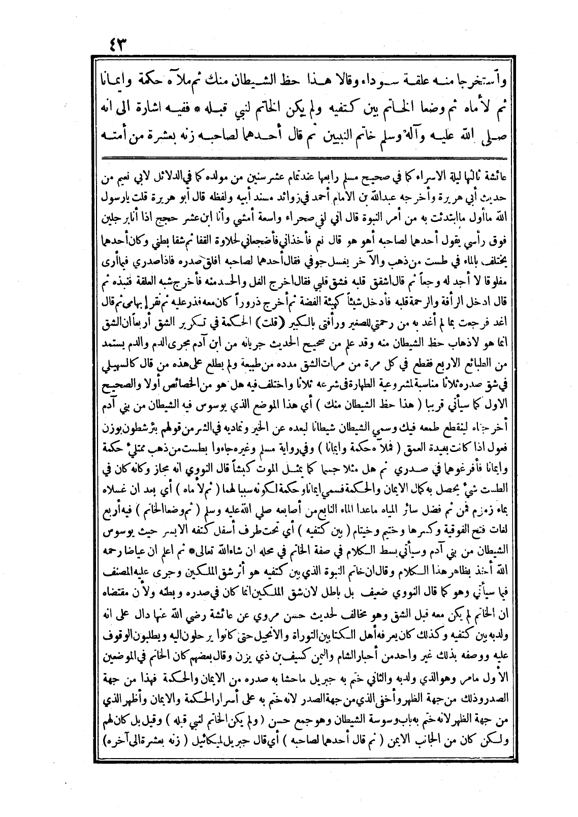 واستخرجا منه علقة سوداء وقالا هذا حظ الشيطان منك ثم ملآه حكمة وايمانا ثم لأماه ثم وضعا الخاتم بين كتفيه ولم يكن الخاتم لنبي قبله* ففيه اشارة الى انه صلى الله عليه وآله وسلم خاتم النبيين ثم قال أحدهما لصاحبه زنه بعشرة من أمته عائشة ثالثها ليلة الاسراء كما في صحيح مسلم رابعها عند تمام عشر سنين من مولده كما في الدلائل لابي نعيم من حديث أبي هريرة وأخرجه عبد الله بن الامام أحمد في زوائد مسند أبيه ولفظه قال أبو هريرة قلت يا رسول الله ما أوّل ما ابتدئت به من أمر النبوة قال اني لفي صحراء واسعة أمشي وأنا ابن عشر حجج اذا أنا برجلين فوق رأسي يقول أحدهما لصاحبه أهو هو قال نعم فأخذاني فأضجعاني لحلاوة القفا ثم شقا بطني وكان أحدهما يختلف بالماء في طست من ذهب والآخر يغسل جوفي فقال أحدهما لصاحبه افلق صدره فاذا صدري فيما أرى مفلوقا لا أجد له وجعا ثم قال اشقق قلبه فشق قلبي فقال اخرج الغل والحسد منه فأخرج شبه العلقة فنبذه ثم قال ادخل الرأفة والرحمة قلبه فأدخل شيئا كهيئة الفضة ثم أخرج ذرورا كان معه فذر عليه ثم نقر إبهامى ثم قال اغد فرجعت بما لم أغد به من رحمتي للصغير ورأفتى بالكبير (قلت) الحكمة في تكرير الشق أربعا ان الشق انما هو لاذهاب حظ الشيطان منه وقد علم من صحيح الحديث جريانه من ابن آدم مجرى الدم والدم يستمد من الطبائع الاربع فقطع في كل مرة من مرات الشق مدده من طبيعة ولم يطلع على هذه من قال كالسهيلي في شق صدره ثلاثا مناسبة لمشروعية الطهارة في شرعه ثلاثا واختلف فيه هل هو من الخصائص أولا والصحيح الاول كما سيأتي قريبا (هذا حظ الشيطان منك) أي هذا الموضع الذي يوسوس فيه الشيطان من بني آدم أخرجناه لينقطع طمعه فيك وسمي الشيطان شيطانا لبعده عن الخير وتماديه في الشر من قولهم بئر شطون بوزن فعول اذا كانت بعيدة العمق (فملآه حكمة وايمانا) وفي رواية مسلم وغيره جاءوا بطست من ذهب ممتليء حكمة وايمانا فأفرغوهما في صدري ثم هل مثلا جسما كما يمثل الموت كبشا قال النووي انه مجاز وكانه كان في الطست شيء يحصل به كمال الايمان والحكمة فسمي ايمانا وحكمة لكونه سببا لهما (ثم لأماه) أي بعد ان غسلاه بماء زمزم فمن ثم فضل سائر المياه ما عدا الماء النابع من أصابعه صلى الله عليه وسلم (ثم وضعا الخاتم) فيه أربع لغات فتح الفوقية وكسرها وختيم وخيتام (بين كتفيه) أي تحت طرف أسفل كتفه الايسر حيث يوسوس الشيطان من بني آدم وسيأتي بسط الكلام في صفة الخاتم في محله ان شاء الله تعالى* ثم اعلم ان عياضا رحمه الله أخذ بظاهر هذا الكلام وقال ان خاتم النبوة الذي بين كتفيه هو أثر شق الملكين وجرى عليه المصنف فيما سيأتي وهو كما قال النووي ضعيف بل باطل لان شق الملكين انما كان في صدره وبطنه ولأن مقتضاه ان الخاتم لم يكن معه قبل الشق وهو مخالف لحديث حسن مروي عن عائشة رضي الله عنها دال على انه ولد به بين كتفيه وكذلك كان يعرفه أهل الكتابين التوراة والانجيل حتى كانوا يرحلون اليه ويطلبون الوقوف عليه ووصفه بذلك غير واحد من أحبار الشام واليمن كسيف بن ذي يزن وقال بعضهم كان الخاتم في الموضعين الأوّل ما مر وهو الذي ولد به والثاني ختم به جبريل ما حشا به صدره من الايمان والحكمة فهذا من جهة الصدور ذلك من جهة الظهر وأخفى الذي من جهة الصدر لانه ختم به على أسرار الحكمة والايمان وأظهر الذي من جهة الظهر لانه ختم به باب وسوسة الشيطان وهو جمع حسن (ولم يكن الخاتم لنبي قبله) وقيل بل كان لهم ولكن كان من الجانب الايمن (ثم قال أحدهما لصاحبه) أي قال جبريل لميكائيل (زنه بعشرة الى آخره)