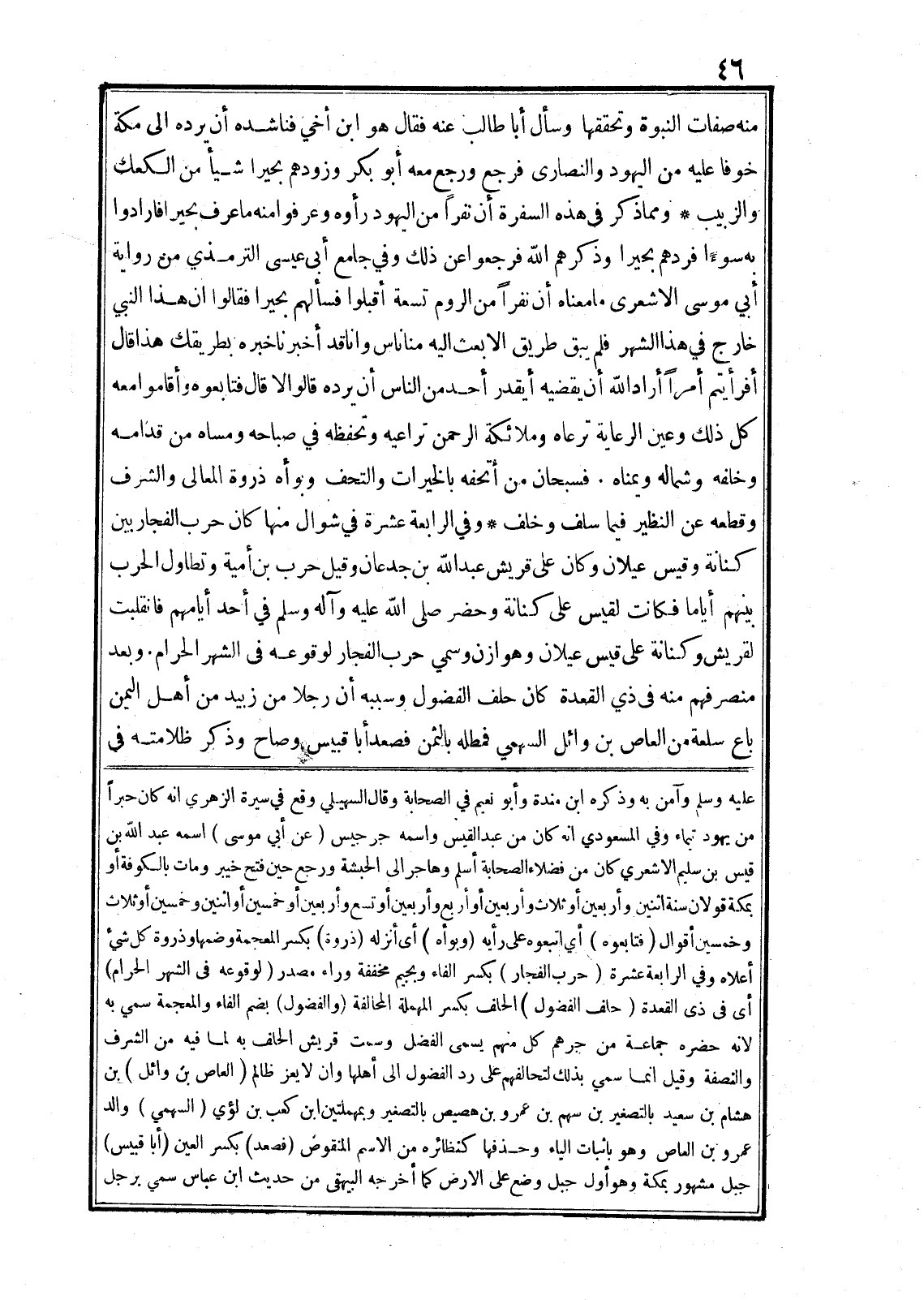 وفي الرابعة عشرة في شوال منها كان حرب الفجار بين كنانة وقيس عيلان وكان على قريش عبد الله بن جدعان وقيل حرب بن أمية وتطاول الحرب بينهم أياما فكانت لقيس على كنانة وحضر صلى الله عليه وآله وسلم في أحد أيامهم فانقلبت لقريش وكنانة على قيس عيلان وهوازن وسمي حرب الفجار لوقوعه في الشهر الحرام. وبعد منصرفهم منه في ذي القعدة كان حلف الفضول وسببه أن رجلا من زبيد من أهل اليمن باع سلعة من العاص بن وائل السهمي فمطله بالثمن فصعد أبا قبيس وصاح وذكر ظلامته في عليه وسلم وآمن به وذكره ابن مندة وأبو نعيم في الصحابة وقال السهيلي وقع في سيرة الزهري انه كان حبرا من يهود تيماء وفي المسعودي انه كان من عبد القيس واسمه جرجيس (عن أبي موسى) اسمه عبد الله بن قيس بن سليم الاشعري كان من فضلاء الصحابة أسلم وهاجر الى الحبشة ورجع حين فتح خيبر ومات بالكوفة أو بمكة قولان سنة اثنين وأربعين أو ثلاث وأربعين أو أربع وأربعين أو تسع وأربعين أو خمسين أو اثنين وخمسين أو ثلاث وخمسين أقوال (فتابعوه) أي اتبعوه على رأيه (وبوأه) أى أنزله (ذروة) بكسر المعجمة وضمها وذروة كل شيء أعلاه وفي الرابعة عشرة (حرب الفجار) بكسر الفاء وبجيم مخففة وراء مصدر (لوقوعه في الشهر الحرام) أى في ذى القعدة (حلف الفضول) الحلف بكسر المهملة المحالفة (والفضول) بضم الفاء والمعجمة سمي به لانه حضره جماعة من جرهم كل منهم يسمى الفضل وسمت قريش الحلف به لما فيه من الشرف والنصفة وقيل انما سمي بذلك لتحالفهم على رد الفضول الى أهلها وان لا يعز ظالم (العاص بن وائل) بن هشام بن سعيد بالتصغير بن سهم بن عمرو بن هصيص بالتصغير وبمهملتين ابن كعب بن لؤي (السهمي) والد عمرو بن العاص وهو باثبات الياء وحذفها كنظائره من الاسم المنقوص (فصعد) بكسر العين (أبا قبيس) جبل مشهور بمكة وهو أوّل جبل وضع على الارض كما أخرجه البيهقى من حديث ابن عباس سمي برجل