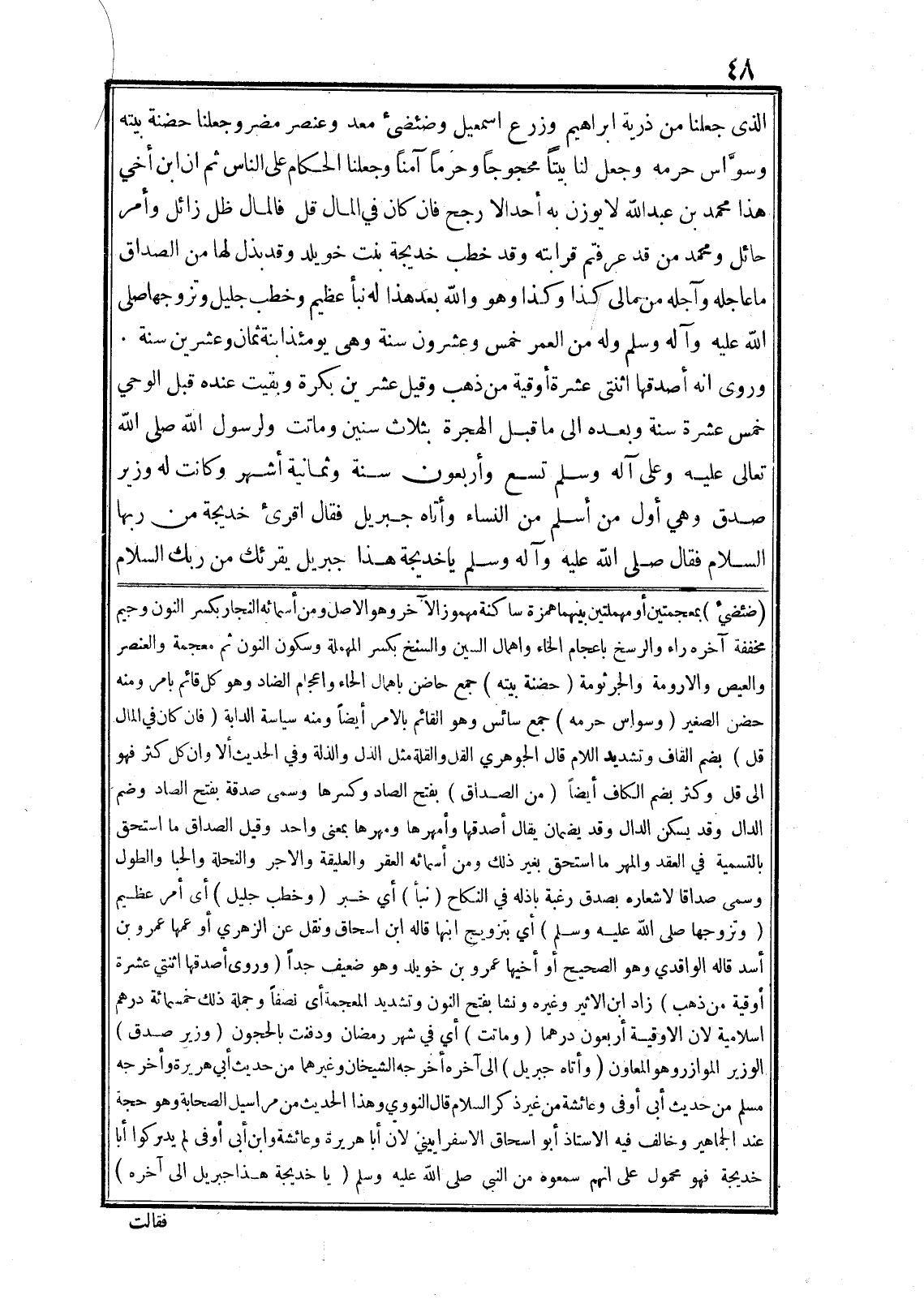 وروى انه أصدقها اثنتى عشرة أوقية من ذهب وقيل عشرين بكرة وبقيت عنده قبل الوحي خمس عشرة سنة وبعده الى ما قبل الهجرة بثلاث سنين وماتت ولرسول الله صلى الله تعالى عليه وعلى آله وسلم تسع وأربعون سنة وثمانية أشهر وكانت له وزير صدق وهي أوّل من أسلم من النساء وأتاه جبريل فقال اقرئ خديجة من ربها السلام فقال صلى الله عليه وآله وسلم يا خديجة هذا جبريل يقرئك من ربك السلام (ضئضيء) بمعجمتين أو مهملتين بينهما همزة ساكنة مهموز الآخر وهو الاصل ومن أسمائه النجار بكسر النون وجيم مخففة آخره راء والرسخ باعجام الخاء واهمال السين والسنخ بكسر المهملة وسكون النون ثم معجمة والعنصر والعيص والارومة والجرثومة (حضنة بيته) جمع حاضن باهمال الحاء واعجام الضاد وهو كل قائم بامر ومنه حضن الصغير (وسواس حرمه) جمع سائس وهو القائم بالامر أيضا ومنه سياسة الدابة (فان كان في المال قل) بضم القاف وتشديد اللام قال الجوهري القل والقلة مثل الذل والذلة وفي الحديث ألا وان كل كثر فهو الى قل وكثر بضم الكاف أيضا (من الصداق) بفتح الصاد وكسرها وسمى صدقة بفتح الصاد وضم الدال وقد يسكن الدال وقد يضمان يقال أصدقها وأمهرها ومهرها بمعنى واحد وقيل الصداق ما استحق بالتسمية في العقد والمهر ما استحق بغير ذلك ومن أسمائه العقر والعليقة والاجر والنحلة والحبا والطول وسمى صداقا لاشعاره بصدق رغبة باذله في النكاح (نبأ) أي خبر (وخطب جليل) أى أمر عظيم (وتزوجها صلى الله عليه وسلم) أي بتزويج ابنها قاله ابن اسحاق ونقل عن الزهري أو عمها عمرو بن أسد قاله الواقدي وهو الصحيح أو أخيها عمرو بن خويلد وهو ضعيف جدا (وروى أصدقها اثنتي عشرة أوقية من ذهب) زاد ابن الاثير وغيره ونشا بفتح النون وتشديد المعجمة أى نصفا وجملة ذلك خمسمائة درهم اسلامية لان الاوقية أربعون درهما (وماتت) أي في شهر رمضان ودفنت بالحجون (وزير صدق) الوزير الموازر وهو المعاون (وأتاه جبريل) الى آخره أخرجه الشيخان وغيرهما من حديث أبي هريرة وأخرجه مسلم من حديث أبى أوفى وعائشة من غير ذكر السلام قال النووي وهذا الحديث من مراسيل الصحابة وهو حجة عند الجماهير وخالف فيه الاستاذ أبو اسحاق الاسفراييني لان أبا هريرة وعائشة وابن أبى أوفى لم يدركوا أبا خديجة فهو محمول على انهم سمعوه من النبي صلى الله عليه وسلم (يا خديجة هذا جبريل الى آخره)