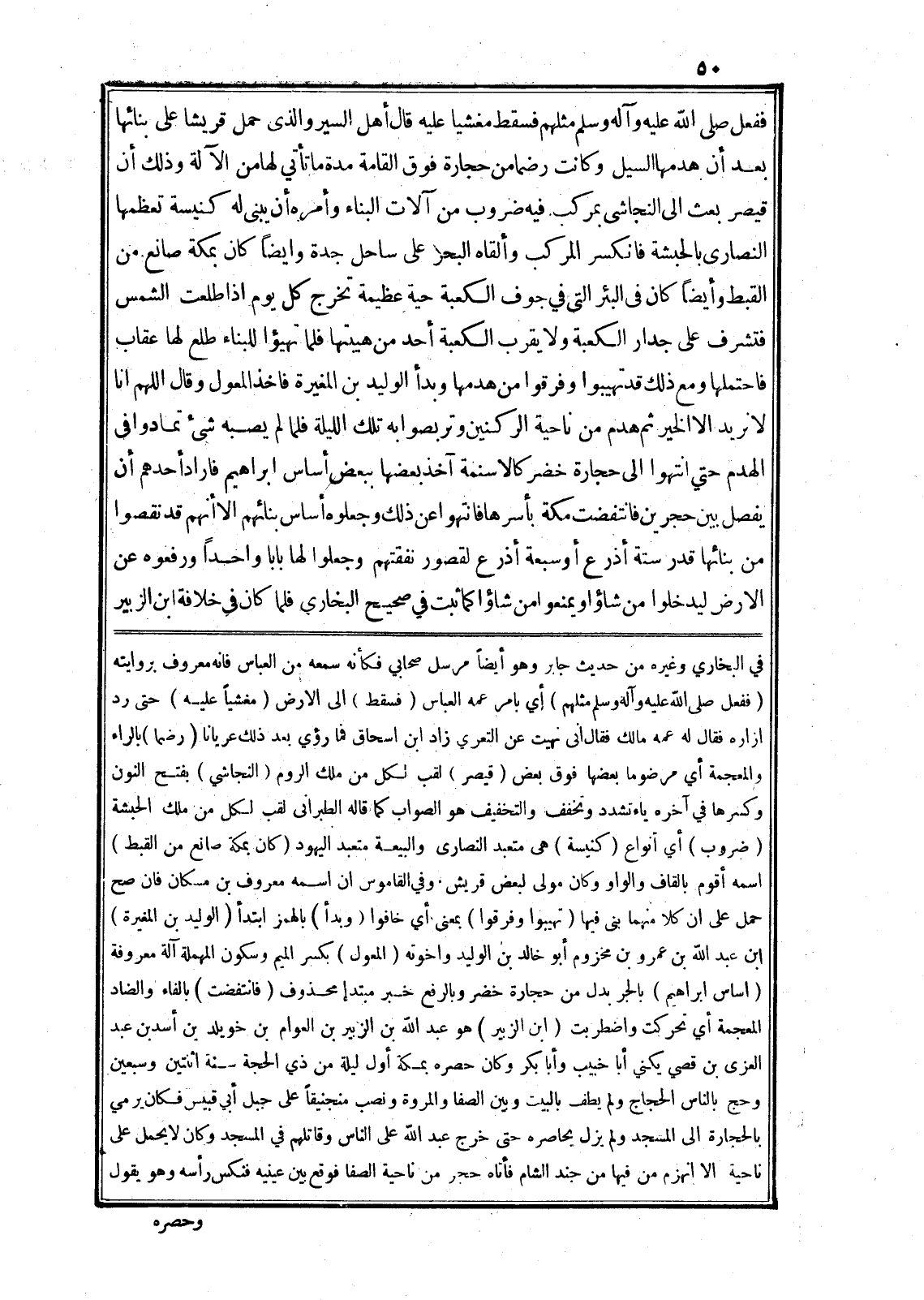 ففعل صلى الله عليه وآله وسلم مثلهم فسقط مغشيا عليه قال أهل السير والذى حمل قريشا على بنائها بعد أن هدمها السيل وكانت رضا من حجارة فوق القامة مدة ما تأتي لها من الآلة وذلك أن قيصر بعث الى النجاشى بمركب فيه ضروب من آلات البناء وأمره أن يبنى له كنيسة تعظمها النصارى بالحبشة فانكسر المركب وألقاه البحر على ساحل جدة وايضا كان بمكة صانع من القبط وأيضا كان في البئر التى في جوف الكعبة حية عظيمة تخرج كل يوم اذا طلعت الشمس فتشرف على جدار الكعبة ولا يقرب الكعبة أحد من هيبتها فلما تهيؤا للبناء طلع لها عقاب فاحتملها ومع ذلك قد تهيبوا وفرقوا من هدمها وبدأ الوليد بن المغيرة فاخذ المعول وقال اللهم انا لا نريد الا الخير ثم هدم من ناحية الركنين وتربصوا به تلك الليلة فلما لم يصبه شئ تمادوا في الهدم حتي انتهوا الى حجارة خضر كالاسنمة آخذ بعضها ببعض أساس ابراهيم فاراد أحدهم أن يفصل بين حجرين فانتفضت مكة بأسرها فانتهوا عن ذلك وجعلوه أساس بنائهم الا أنهم قد نقصوا من بنائها قدر ستة أذرع أو سبعة أذرع لقصور نفقتهم وجعلوا لها بابا واحدا ورفعوه عن الارض ليدخلوا من شاؤا ويمنعوا من شاؤا كما ثبت في صحيح البخاري فلما كان في خلافة ابن الزبير في البخاري وغيره من حديث جابر وهو أيضا مرسل صحابي فكأنه سمعه من العباس فانه معروف بروايته (ففعل صلى الله عليه وآله وسلم مثلهم) أي بامر عمه العباس (فسقط) الى الارض (مغشيا عليه) حتى رد ازاره فقال له عمه مالك فقال انى نهيت عن التعري زاد ابن اسحاق فما رؤي بعد ذلك عريانا (رضما) بالراء والمعجمة أي مرضوما بعضها فوق بعض (قيصر) لقب لكل من ملك الروم (النجاشي) بفتح النون وكسرها في آخره ياء تشدد وتخفف والتخفيف هو الصواب كما قاله الطبرانى لقب لكل من ملك الحبشة (ضروب) أي أنواع (كنيسة) هى متعبد النصارى والبيعة متعبد اليهود (كان بمكة صانع من القبط) اسمه أقوم بالقاف والواو وكان مولى لبعض قريش وفي القاموس ان اسمه معروف بن مسكان فان صح حمل على ان كلا منهما بنى فيها (تهيبوا وفرقوا) بمعنى أي خافوا (وبدأ) بالهمز ابتدأ (الوليد بن المغيرة) ابن عبد الله بن عمرو بن مخزوم أبو خالد بن الوليد واخوته (المعول) بكسر الميم وسكون المهملة آلة معروفة (اساس ابراهيم) بالجر بدل من حجارة خضر وبالرفع خبر مبتدإ محذوف (فانتفضت) بالفاء والضاد المعجمة أي تحركت واضطربت (ابن الزبير) هو عبد الله بن الزبير بن العوام بن خويلد بن أسد بن عبد العزى بن قصي يكني أبا خبيب وأبا بكر وكان حصره بمكة أوّل ليلة من ذي الحجة سنة اثنتين وسبعين وحج بالناس الحجاج ولم يطف بالبيت وبين الصفا والمروة ونصب منجنيقا على جبل أبي قبيس فكان يرمي بالحجارة الى المسجد ولم يزل يحاصره حتى خرج عبد الله على الناس وقاتلهم في المسجد وكان لا يحمل على ناحية الا انهزم من فيها من جند الشام فأتاه حجر من ناحية الصفا فوقع بين عينيه فنكس رأسه وهو يقول