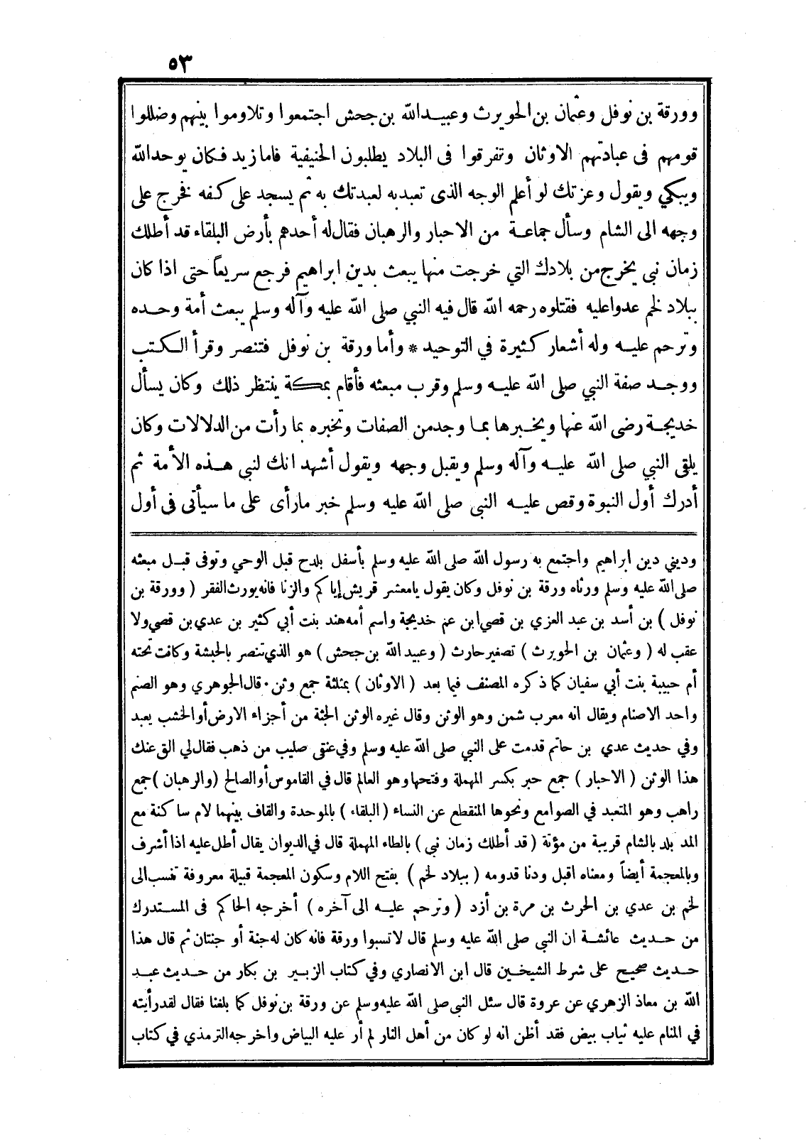 وأما ورقة بن نوفل فتنصر وقرأ الكتب ووجد صفة النبي صلى الله عليه وسلم وقرب مبعثه فأقام بمكة ينتظر ذلك وكان يسأل خديجة رضى الله عنها ويخبرها بما وجد من الصفات وتخبره بما رأت من الدلالات وكان يلقى النبي صلى الله عليه وآله وسلم ويقبل وجهه ويقول أشهد انك لنبى هذه الأمة ثم أدرك أوّل النبوة وقص عليه النبى صلى الله عليه وسلم خبر ما رأى على ما سيأتى في أوّل وديني دين ابراهيم واجتمع به رسول الله صلى الله عليه وسلم بأسفل بلدح قبل الوحي وتوفي قبل مبعثه صلى الله عليه وسلم ورثاه ورقة بن نوفل وكان يقول يا معشر قريش إياكم والزنا فانه يورث الفقر (وورقة بن نوفل) بن أسد بن عبد العزي بن قصي ابن عم خديجة واسم أمه هند بنت أبي كثير بن عدي بن قصي ولا عقب له (وعثمان بن الحويرث) تصغير حارث (وعبيد الله بن جحش) هو الذي تنصر بالحبشة وكانت تحته أم حبيبة بنت أبي سفيان كما ذكره المصنف فيما بعد (الاوثان) بمثلثة جمع وثن. قال الجوهري وهو الصنم واحد الاصنام ويقال انه معرب شمن وهو الوثن وقال غيره الوثن الجثة من أجزاء الارض أو الخشب يعبد وفي حديث عدي بن حاتم قدمت على النبي صلى الله عليه وسلم وفي عنقى صليب من ذهب فقال لي الق عنك هذا الوثن (الاحبار) جمع حبر بكسر المهملة وفتحها وهو العالم قال في القاموس أو الصالح (والرهبان) جمع راهب وهو المتعبد في الصوامع ونحوها المنقطع عن النساء (البلقاء) بالموحدة والقاف بينهما لام ساكنة مع المد بلد بالشام قريبة من مؤتة (قد أطلك زمان نبى) بالطاء المهملة قال في الديوان يقال أطل عليه اذا أشرف وبالمعجمة أيضا ومعناه اقبل ودنا قدومه (ببلاد لخم) بفتح اللام وسكون المعجمة قبيلة معروفة تنسب الى لخم بن عدي بن الحرث بن مرة بن أزد (وترحم عليه الى آخره) أخرجه الحاكم في المستدرك من حديث عائشة ان النبى صلى الله عليه وسلم قال لا تسبوا ورقة فانه كان له جنة أو جنتان ثم قال هذا حديث صحيح على شرط الشيخين قال ابن الانصاري وفي كتاب الزبير بن بكار من حديث عبد الله بن معاذ الزهري عن عروة قال سئل النبى صلى الله عليه وسلم عن ورقة بن نوفل كما بلغنا فقال لقد رأيته في المنام عليه ثياب بيض فقد أظن انه لو كان من أهل النار لم أر عليه البياض وأخرجه الترمذي في كتاب