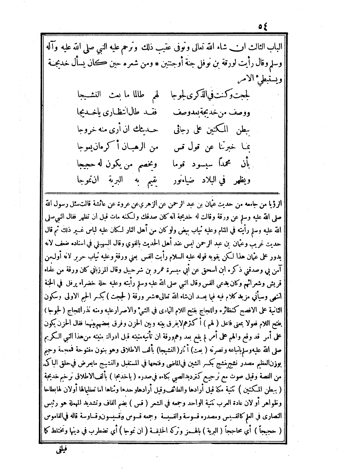 الرؤيا من جامعه من حديث عثمان بن عبد الرحمن عن الزهري عن عروة عن عائشة قالت سئل رسول الله صلى الله عليه وسلم عن ورقة وقالت له خديجة انه كان صدقك ولكنه مات قبل ان تظهر فقال النبي صلى الله عليه وسلم رأيته في المنام وعليه ثياب بيض ولو كان من أهل النار لكان عليه لباس غير ذلك ثم قال حديث غريب وعثمان بن عبد الرحمن ليس عند أهل الحديث بالقوي وقال السهيلي في اسناده ضعف لانه يدور على عثمان هذا لكن يقويه قوله عليه السلام رأيت القس يعني ورقة وعليه ثياب حرير لانه أوّل من آمن بي وصدقني ذكره ابن اسحق عن أبي ميسرة عمرو بن شرحبيل وقال المرزباني كان ورقة من علماء قريش وشعرائهم وكان يدعى القس وقال النبي صلى الله عليه وسلم رأيته وعليه حلة خضراء يرفل في الجنة انتهى وسيأتي مزيد كلام فيه فيما بعد ان شاء الله تعالى* شعر ورقة (لججت) بكسر الجيم الاولى وسكون الثانية على الافصح كنظائره واللجاج بفتح اللام التمادى في الشيء والاصرار عليه ومنه نذرا للجاج (لجوجا) بفتح اللام فعولا بمعنى فاعل (لهم) أكثرهم لا يفرق بينه وبين الحزن وفرق بعضهم بينهما فقال الحزن يكون على أمر قد وقع والهم على أمر لم يقع بعد وهم ورقة ان تأتيه منيته قبل ادراك منيته من هذا النبي الكريم صلى الله عليه وسلم باتباعه ونصرته (بعث) أثار (النشيجا) بألف الاطلاق وهو بنون مفتوحة فمعجمة وجيم بوزن العظيم مصدر نشج ينشج بكسر الشين في الماضى وفتحها في المستقبل والنشيج ما يعرض في حلق الباكى من الغصة وقيل صوت مع ترجيع كترديد الصبي بكاءه في صدره (يا خديجا) بألف الاطلاق ترخيم خديجة (ببطن المكتين) تثنية مكة قيل أرادها والطائف وقيل أرادها وحدها وثناها اما تعظيما لها أولان لها بطاحا وظواهر أو لان عادة العرب تثنية الواحد وجمعه في الشعر (قس) بضم القاف وتشديد المهملة هو رئيس النصارى في العلم كالقسيس ومصدره قسوسة والقسيسة وجمعه قسوس وقسيسون وقساوسة قاله في القاموس (حجيجا) أي محاججا (البرية) بالهمز وتركه الخليقة (ان تموجا) أي تضطرب في دينها وتختلط كما