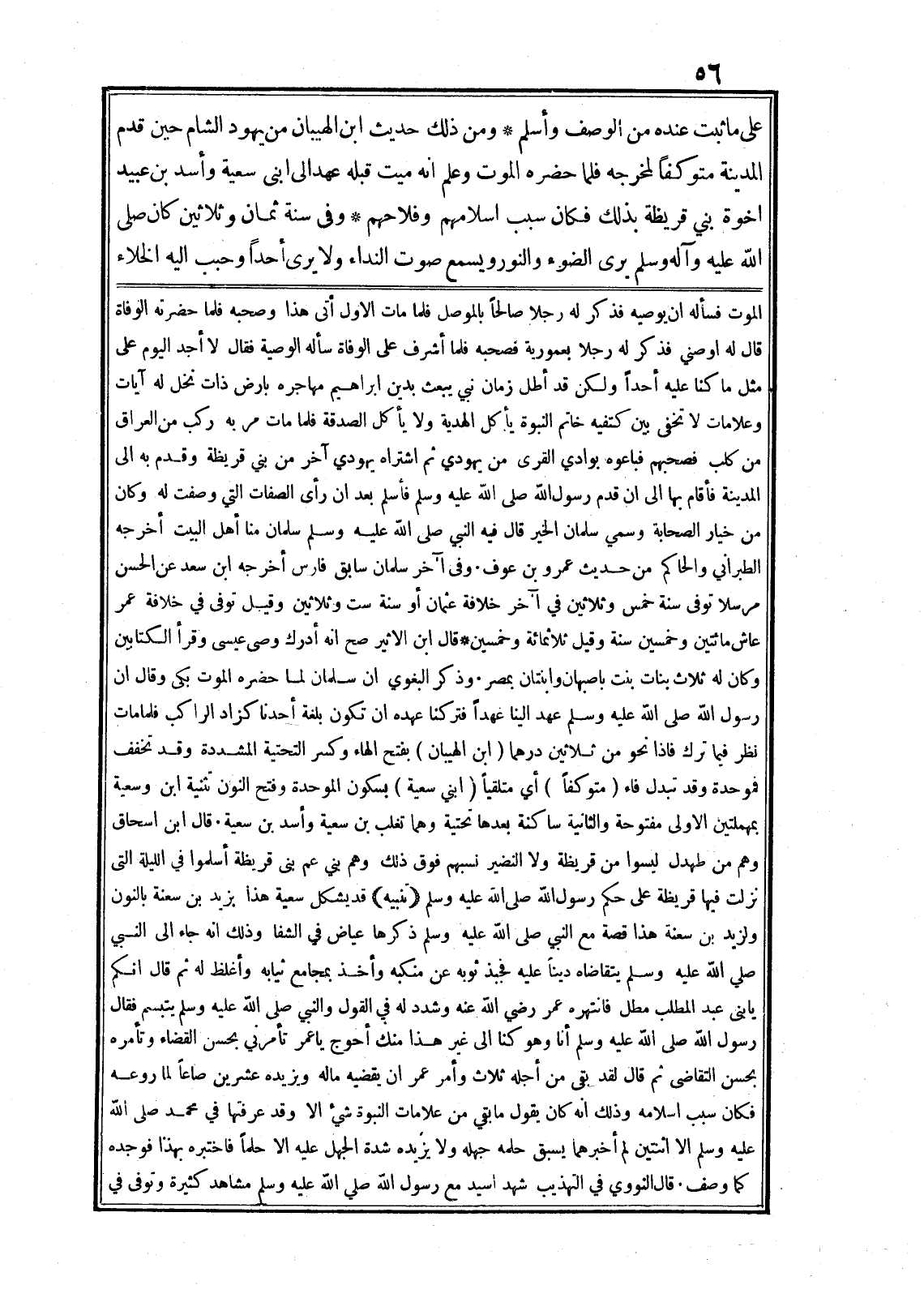 وفي سنة ثمان وثلاثين كان صلى الله عليه وآله وسلم يرى الضوء والنور ويسمع صوت النداء ولا يرى أحدا وحبب اليه الخلاء الموت فسأله ان يوصيه فذكر له رجلا صالحا بالموصل فلما مات الاول أتى هذا وصحبه فلما حضرته الوفاة قال له اوصني فذكر له رجلا بعمورية فصحبه فلما أشرف على الوفاة سأله الوصية فقال لا أجد اليوم على مثل ما كنا عليه أحدا ولكن قد أطل زمان نبي يبعث بدين ابراهيم مهاجره بارض ذات نخل له آيات وعلامات لا تخفى بين كتفيه خاتم النبوة يأكل الهدية ولا يأكل الصدقة فلما مات مر به ركب من العراق من كلب فصحبهم فباعوه بوادي القرى من يهودي ثم اشتراه يهودي آخر من بني قريظة وقدم به الى المدينة فأقام بها الى ان قدم رسول الله صلى الله عليه وسلم فأسلم بعد ان رأى الصفات التي وصفت له وكان من خيار الصحابة وسمي سلمان الخير قال فيه النبي صلى الله عليه وسلم سلمان منا أهل البيت أخرجه الطبراني والحاكم من حديث عمرو بن عوف. وفي آخر سلمان سابق فارس أخرجه ابن سعد عن الحسن مرسلا توفي سنة خمس وثلاثين في آخر خلافة عثمان أو سنة ست وثلاثين وقيل توفى في خلافة عمر عاش مائتين وخمسين سنة وقيل ثلاثمائة وخمسين* قال ابن الاثير صح انه أدرك وصى عيسى وقرأ الكتابين وكان له ثلاث بنات بنت باصبهان وابنتان بمصر. وذكر البغوي ان سلمان لما حضره الموت بكى وقال ان رسول الله صلى الله عليه وسلم عهد الينا عهدا فتركنا عهده ان تكون بلغة أحدنا كزاد الراكب فلما مات نظر فيما ترك فاذا نحو من ثلاثين درهما (ابن الهيبان) بفتح الهاء وكسر التحتية المشددة وقد تخفف فموحدة وقد تبدل فاء (متوكفا) أي متلقيا (ابني سعية) بسكون الموحدة وفتح النون تثنية ابن وسعية بمهملتين الاولى مفتوحة والثانية ساكنة بعدها تحتية وهما تغلب بن سعية وأسد بن سعية. قال ابن اسحاق وهم من طهدل ليسوا من قريظة ولا النضير نسبهم فوق ذلك وهم بني عم بنى قريظة أسلموا في الليلة التى نزلت فيها قريظة على حكم رسول الله صلى الله عليه وسلم (تنبيه) قد يشكل سعية هذا بزيد بن سعنة بالنون ولزيد بن سعنة هذا قصة مع النبي صلى الله عليه وسلم ذكرها عياض في الشفا وذلك انه جاء الى النبي صلى الله عليه وسلم يتقاضاه دينا عليه فجبذ ثوبه عن منكبه وأخذ بمجامع ثيابه وأغلظ له ثم قال انكم يا بني عبد المطلب مطل فانتهره عمر رضي الله عنه وشدد له في القول والنبي صلى الله عليه وسلم يتبسم فقال رسول الله صلى الله عليه وسلم أنا وهو كنا الى غير هذا منك أحوج يا عمر تأمرني بحسن القضاء وتأمره بحسن التقاضى ثم قال لقد بقى من أجله ثلاث وأمر عمر ان يقضيه ماله ويزيده عشرين صاعا لما روعه فكان سبب اسلامه وذلك انه كان يقول ما بقي من علامات النبوة شيء الا وقد عرفتها في محمد صلى الله عليه وسلم الا اثنتين لم أخبرهما يسبق حلمه جهله ولا يزيده شدة الجهل عليه الا حلما فاختبره بهذا فوجده كما وصف. قال النووي في التهذيب شهد اسيد مع رسول الله صلى الله عليه وسلم مشاهد كثيرة وتوفى في