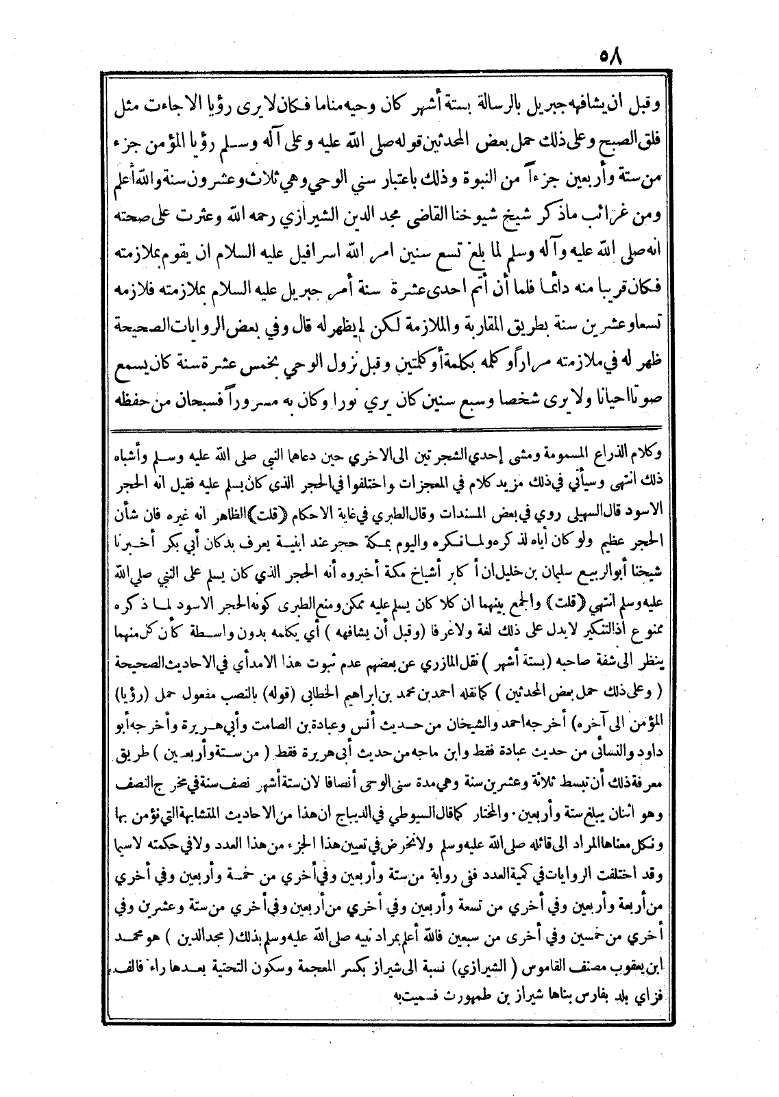 وقبل ان يشافهه جبريل بالرسالة بستة أشهر كان وحيه مناما فكان لا يرى رؤيا الاجاءت مثل فلق الصبح وعلى ذلك حمل بعض المحدثين قوله صلى الله عليه وعلى آله وسلم رؤيا المؤمن جزء من ستة وأربعين جزءا من النبوة وذلك باعتبار سني الوحي وهي ثلاث وعشرون سنة والله أعلم ومن غرائب ما ذكر شيخ شيوخنا القاضى مجد الدين الشيرازي رحمه الله وعثرت على صحته انه صلى الله عليه وآله وسلم لما بلغ تسع سنين امر الله اسرافيل عليه السلام ان يقوم بملازمته فكان قريبا منه دائما فلما أن أتم احدى عشرة سنة أمر جبريل عليه السلام بملازمته فلازمه تسعا وعشرين سنة بطريق المقاربة والملازمة لكن لم يظهر له قال وفي بعض الروايات الصحيحة ظهر له في ملازمته مرارا وكلمه بكلمة أو كلمتين وقبل نزول الوحي بخمس عشرة سنة كان يسمع صوتا احيانا ولا يرى شخصا وسبع سنين كان يري نورا وكان به مسرورا فسبحان من حفظه وكلام الذراع المسمومة ومشى إحدي الشجرتين الى الاخري حين دعاهما النبى صلى الله عليه وسلم وأشباه ذلك انتهى وسيأتي في ذلك مزيد كلام في المعجزات واختلفوا في الحجر الذي كان يسلم عليه فقيل انه الحجر الاسود قال السهيلى روي في بعض المسندات وقال الطبري في غاية الاحكام (قلت) الظاهر انه غيره فان شأن الحجر عظيم ولو كان أياه لذكره ولما نكره واليوم بمكة حجر عند ابنية يعرف بدكان أبي بكر أخبرنا شيخنا أبو الربيع سليمان بن خليل ان أكابر أشياخ مكة أخبروه أنه الحجر الذي كان يسلم على النبي صلى الله عليه وسلم انتهي (قلت) والجمع بينهما ان كلا كان يسلم عليه ممكن ومنع الطبرى كونه الحجر الاسود لما ذكره ممنوع اذ التنكير لا يدل على ذلك لغة ولا عرفا (وقبل أن يشافهه) أي يكلمه بدون واسطة كأن كل منهما ينظر الى شفة صاحبه (بستة أشهر) نقل المازري عن بعضهم عدم ثبوت هذا الامد أي في الاحاديث الصحيحة (وعلى ذلك حمل بعض المحدثين) كما نقله احمد بن محمد بن ابراهيم الخطابى (قوله) بالنصب مفعول حمل (رؤيا) المؤمن الى آخره أخرجه احمد والشيخان من حديث أنس وعبادة بن الصامت وأبي هريرة وأخرجه أبو داود والنسائى من حديث عبادة فقط وابن ماجه من حديث أبى هريرة فقط (من ستة وأربعين) طريق معرفة ذلك أن تبسط ثلاثة وعشرين سنة وهي مدة سنى الوحى أنصافا لان ستة أشهر نصف سنة في مخرج النصف وهو اثنان يبلغ ستة وأربعين. والمختار كما قال السيوطي في الديباج ان هذا من الاحاديث المتشابهة التي نؤمن بها ونكل معناها المراد الى قائله صلى الله عليه وسلم ولا نخوض في تعيين هذا الجزء من هذا العدد ولا في حكمته لا سيما وقد اختلفت الروايات في كمية العدد ففي رواية من ستة وأربعين وفي أخري من خمسة وأربعين وفي أخري من أربعة وأربعين وفي أخري من تسعة وأربعين وفي أخرى من أربعين وفي أخري من ستة وعشرين وفي أخري من خمسين وفي أخرى من سبعين فالله أعلم بمراد نبيه صلى الله عليه وسلم بذلك (مجد الدين) هو محمد ابن يعقوب مصنف القاموس (الشيرازي) نسبة الى شيراز بكسر المعجمة وسكون التحتية بعدها راء فالف فزاي بلد بفارس بناها شيراز بن طهمورث فسميت به