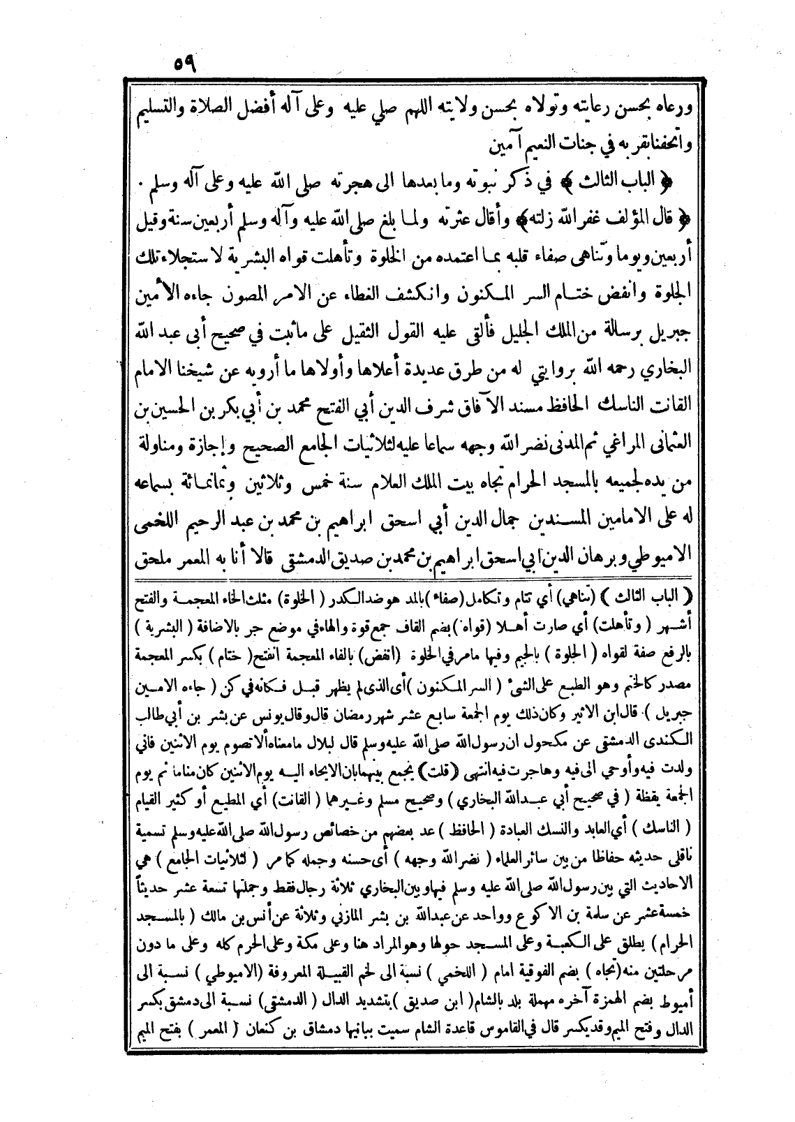 (قال المؤلف غفر الله زلته) وأقال عثرته ولما بلغ صلى الله عليه وآله وسلم أربعين سنة وقيل أربعين ويوما وتناهى صفاء قلبه بما اعتمده من الخلوة وتأهلت قواه البشرية لاستجلاء تلك الجلوة وانفض ختام السر المكنون وانكشف الغطاء عن الامر المصون جاءه الأمين جبريل برسالة من الملك الجليل فألقى عليه القول الثقيل على ما ثبت في صحيح أبى عبد الله البخاري رحمه الله بروايتي له من طرق عديدة أعلاها وأولاها ما أرويه عن شيخنا الامام القانت الناسك الحافظ مسند الآفاق شرف الدين أبي الفتح محمد بن أبي بكر بن الحسين بن العثمانى المراغي ثم المدنى نضر الله وجهه سماعا عليه لثلاثيات الجامع الصحيح وإجازة ومناولة من يده لجميعه بالمسجد الحرام تجاه بيت الملك العلام سنة خمس وثلاثين وثمانمائة بسماعه له على الامامين المسندين جمال الدين أبي اسحق ابراهيم بن محمد بن عبد الرحيم اللخمى الاميوطي وبرهان الدين ابي اسحق ابراهيم بن محمد بن صديق الدمشقى قالا أنا به المعمر ملحق (الباب الثالث) (تناهي) أي تتام وتكامل (صفاء) بالمد هو ضد الكدر (الخلوة) مثلث الخاء المعجمة والفتح أشهر (وتأهلت) أي صارت أهلا (قواه) بضم القاف جمع قوة والهاء في موضع جر بالاضافة (البشرية) بالرفع صفة لقواه (الجلوة) بالجيم وفيها ما مر في الخلوة (انفض) بالفاء المعجمة انفتح (ختام) بكسر المعجمة مصدر كالختم وهو الطبع على الشئ (السر المكنون) أى الذى لم يظهر قبل فكانه في كن (جاءه الامين جبريل) . قال ابن الاثير وكان ذلك يوم الجمعة سابع عشر شهر رمضان قال وقال يونس عن بشر بن أبي طالب الكندى الدمشقى عن مكحول ان رسول الله صلى الله عليه وسلم قال لبلال ما معناه ألا تصوم يوم الاثنين فاني ولدت فيه وأوحي الى فيه وهاجرت فيه انتهى (قلت) يجمع بينهما بان الايحاء اليه يوم الاثنين كان منا ما ثم يوم الجمعة يقظة (في صحيح أبي عبد الله البخاري) وصحيح مسلم وغيرهما (القانت) أي المطيع أو كثير القيام (الناسك) أي العابد والنسك العبادة (الحافظ) عد بعضهم من خصائص رسول الله صلى الله عليه وسلم تسمية ناقلى حديثه حفاظا من بين سائر العلماء (نضر الله وجهه) أى حسنه وجمله كما مر (لثلاثيات الجامع) هي الاحاديث التي بين رسول الله صلى الله عليه وسلم فيها وبين البخاري ثلاثة رجال فقط وجملتها تسعة عشر حديثا خمسة عشر عن سلمة بن الاكوع وواحد عن عبد الله بن بشر المازني وثلاثة عن أنس بن مالك (بالمسجد الحرام) يطلق على الكعبة وعلى المسجد حولها وهو المراد هنا وعلى مكة وعلى الحرم كله وعلى ما دون مرحلتين منه (تجاه) بضم الفوقية امام (اللخمي) نسبة الى لخم القبيلة المعروفة (الاميوطي) نسبة الى أميوط بضم الهمزة آخره مهملة بلد بالشام (ابن صديق) بتشديد الدال (الدمشقي) نسبة الى دمشق بكسر الدال وفتح الميم وقد يكسر قال في القاموس قاعدة الشام سميت ببانيها دمشاق بن كنعان (المعمر) بفتح الميم