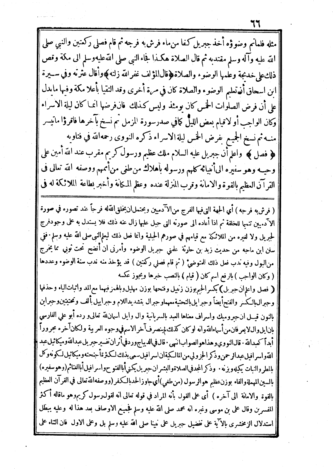(فصل) واعلم أن جبريل عليه السلام ملك عظيم ورسول كريم مقرب عند الله أمين على وحيه وهو سفيره الى أنبيائه كلهم ورسوله باهلاك من طغى من أممهم ووصفه الله تعالى في القرآن العظيم بالقوة والامانة وقرب المنزلة عنده وعظم المكانة وأخبر بطاعة الملائكة له في (فرش به فرجه) أي الجهة التى فيها الفرج من الآدميين ويحتمل ان يخلق الله له فرجا عند تصوره في صورة الآدميين تتميما للخلقة ثم اذا أعاده الى صورته التى جبل عليها زال عنه ذلك فلا يستدل به على وجود فرج لجبريل ولا لغيره من الملائكة مع قيامهم في صورهم الجبلية وانما فعل ذلك ليعلم النبى صلى الله عليه وسلم. ففي سنن ابن ماجه من حديث زيد بن حارثة علمني جبريل الوضوء وأمرنى ان أنضح تحت ثوبي مما يخرج من البول وفيه ندب فعل ذلك للمتوضيء (ثم قام فصلي ركعتين) قد يؤخذ منه ندب سنة الوضوء وعددها (وكان الواجب) بالرفع اسم كان (قيام) بالنصب خبرها ويجوز عكسه