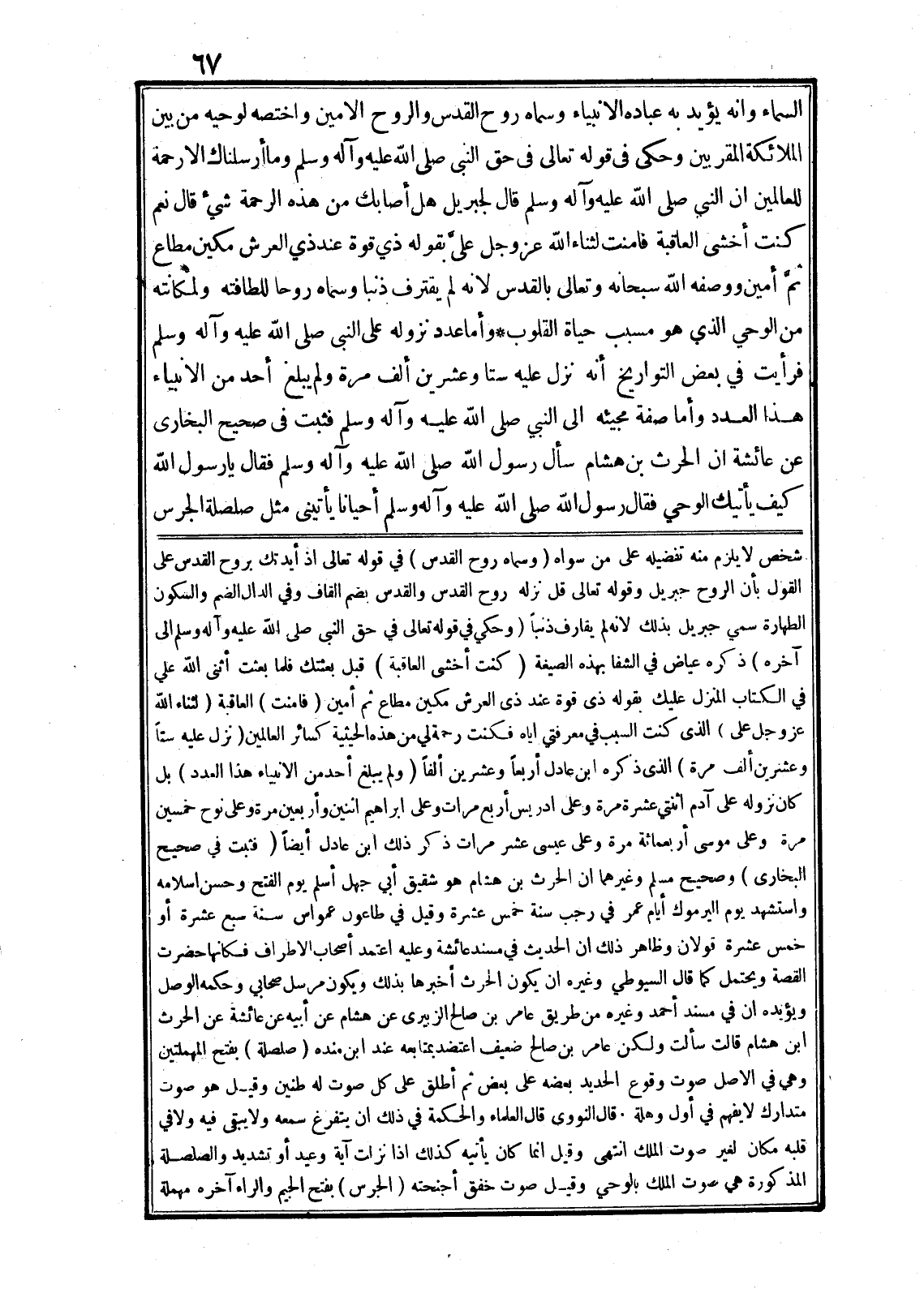 السماء وانه يؤيد به عباده الانبياء وسماه روح القدس والروح الامين واختصه لوحيه من بين الملائكة المقربين وحكى في قوله تعالى في حق النبى صلى الله عليه وآله وسلم وَما أَرْسَلْناكَ إِلَّا رَحْمَةً لِلْعالَمِينَ ان النبي صلى الله عليه وآله وسلم قال لجبريل هل أصابك من هذه الرحمة شيء قال نعم كنت أخشى العاقبة فامنت لثناء الله عز وجل علىّ بقوله ذِي قُوَّةٍ عِنْدَ ذِي الْعَرْشِ مَكِينٍ مُطاعٍ ثَمَّ أَمِينٍ ووصفه الله سبحانه وتعالى بالقدس لانه لم يقترف ذنبا وسماه روحا للطافته ولمكانته من الوحي الذي هو مسبب حياة القلوب* وأما عدد نزوله على النبى صلى الله عليه وآله وسلم فرأيت في بعض التواريخ أنه نزل عليه ستا وعشرين ألف مرة ولم يبلغ أحد من الانبياء هذا العدد وأما صفة مجيئه الى النبي صلى الله عليه وآله وسلم فثبت في صحيح البخارى عن عائشة ان الحرث بن هشام سأل رسول الله صلى الله عليه وآله وسلم فقال يا رسول الله كيف يأتيك الوحي فقال رسول الله صلى الله عليه وآله وسلم أحيانا يأتينى مثل صلصلة الجرس شخص لا يلزم منه تفضيله على من سواه (وسماه روح القدس) في قوله تعالى إِذْ أَيَّدْتُكَ بِرُوحِ الْقُدُسِ على القول بأن الروح جبريل وقوله تعالى قُلْ نَزَّلَهُ رُوحُ الْقُدُسِ والقدس بضم القاف وفي الدال الضم والسكون الطهارة سمي جبريل بذلك لانه لم يقارف ذنبا (وحكي في قوله تعالى في حق النبى صلى الله عليه وآله وسلم الى آخره) ذكره عياض في الشفا بهذه الصيغة (كنت أخشى العاقبة) قبل بعثتك فلما بعثت أثنى الله علي في الكتاب المنزل عليك بقوله ذِي قُوَّةٍ عِنْدَ ذِي الْعَرْشِ مَكِينٍ مُطاعٍ ثَمَّ أَمِينٍ (فامنت) العاقبة (لثناء الله عز وجل على) الذى كنت السبب في معرفتي اياه فكنت رحمة لي من هذه الحيثية كسائر العالمين (نزل عليه ستا وعشرين ألف مرة) الذى ذكره ابن عادل أربعا وعشرين ألفا (ولم يبلغ أحد من الانبياء هذا العدد) بل كان نزوله على آدم اثنتي عشرة مرة وعلى ادريس أربع مرات وعلى ابراهيم اثنين وأربعين مرة وعلى نوح خمسين مرة وعلى موسى أربعمائة مرة وعلى عيسى عشر مرات ذكر ذلك ابن عادل أيضا (فثبت في صحيح البخارى) وصحيح مسلم وغيرهما ان الحرث بن هشام هو شقيق أبي جهل أسلم يوم الفتح وحسن اسلامه واستشهد يوم اليرموك أيام عمر في رجب سنة خمس عشرة وقيل في طاعون عمواس سنة سبع عشرة أو خمس عشرة قولان وظاهر ذلك ان الحديث في مسند عائشة وعليه اعتمد أصحاب الاطراف فكانها حضرت القصة ويحتمل كما قال السيوطي وغيره ان يكون الحرث أخبرها بذلك ويكون مرسل صحابي وحكمه الوصل ويؤيده ان في مسند أحمد وغيره من طريق عامر بن صالح الزبيرى عن هشام عن أبيه عن عائشة عن الحرث ابن هشام قالت سألت ولكن عامر بن صالح ضعيف اعتضد بمتابعه عند ابن منده (صلصلة) بفتح المهملتين وهي في الاصل صوت وقوع الحديد بعضه على بعض ثم أطلق على كل صوت له طنين وقيل هو صوت متدارك لا يفهم في أوّل وهلة. قال النووى قال العلماء والحكمة في ذلك ان يتفرغ سمعه ولا يبقى فيه ولا في قلبه مكان لغير صوت الملك انتهى وقيل انما كان يأتيه كذلك اذا نزلت آية وعيد أو تشديد والصلصلة المذكورة هي صوت الملك بالوحي وقيل صوت خفق أجنحته (الجرس) بفتح الجيم والراء آخره مهملة
