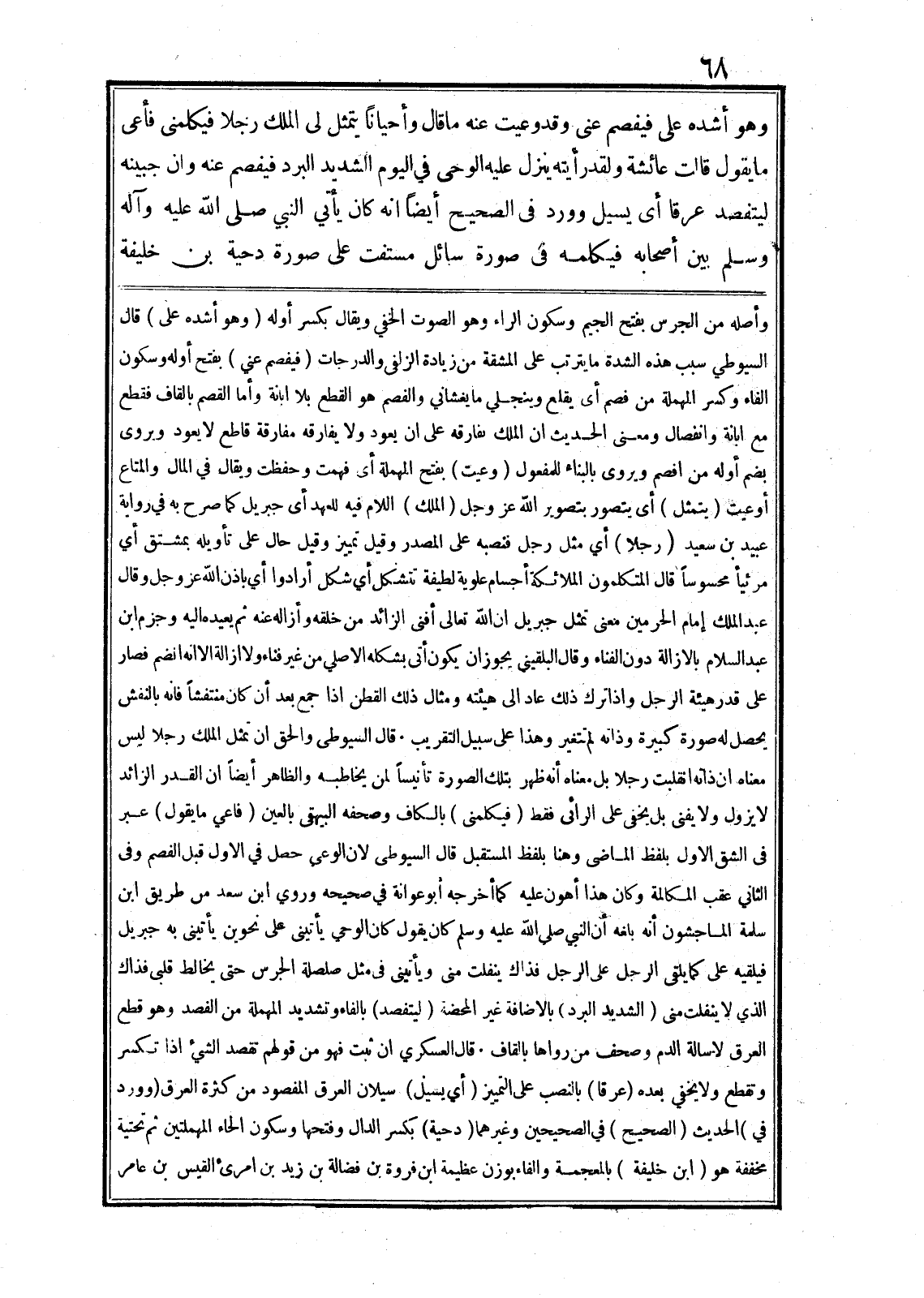 وهو أشده على فيفصم عنى وقد وعيت عنه ما قال وأحيانا يتمثل لى الملك رجلا فيكلمنى فأعى ما يقول قالت عائشة ولقد رأيته ينزل عليه الوحى في اليوم الشديد البرد فيفصم عنه وان جبينه ليتفصد عرقا أى يسيل وورد في الصحيح أيضا انه كان يأتي النبي صلى الله عليه وآله وسلم بين أصحابه فيكلمه في صورة سائل مستفت على صورة دحية بن خليفة وأصله من الجرس بفتح الجيم وسكون الراء وهو الصوت الخفي ويقال بكسر أوله (وهو أشده على) قال السيوطي سبب هذه الشدة ما يترتب على المشقة من زيادة الزلفى والدرجات (فيفصم عني) بفتح أوله وسكون الفاء وكسر المهملة من فصم أى يقلع وينجلي ما يغشاني والفصم هو القطع بلا ابانة وأما القصم بالقاف فقطع مع ابانة وانفصال ومعنى الحديث ان الملك يفارقه على ان يعود ولا يفارقه مفارقة قاطع لا يعود ويروى بضم أوله من افصم ويروى بالبناء للمفعول (وعيت) بفتح المهملة أى فهمت وحفظت ويقال في المال والمتاع أوعيت (يتمثل) أى يتصور بتصوير الله عز وجل (الملك) اللام فيه للعهد أى جبريل كما صرح به في رواية عبيد بن سعيد (رجلا) أي مثل رجل فنصبه على المصدر وقيل تمييز وقيل حال على تأويله بمشتق أي مرئيأ محسوسا قال المتكلمون الملائكة أجسام علوية لطيفة تتشكل أي شكل أرادوا أي باذن الله عز وجل وقال عبد الملك إمام الحرمين معنى تمثل جبريل ان الله تعالى أفنى الزائد من خلقه وأزاله عنه ثم يعيده اليه وجزم ابن عبد السلام بالازالة دون الفناء وقال البلقيني يجوز ان يكون أتى بشكله الاصلي من غير فناء ولا ازالة الا انه انضم فصار على قدر هيئة الرجل واذا ترك ذلك عاد الى هيئته ومثال ذلك القطن اذا جمع بعد أن كان منتفشا فانه بالنفش يحصل له صورة كبيرة وذاته لم تتغير وهذا على سبيل التقريب. قال السيوطى والحق ان تمثل الملك رجلا ليس معناه ان ذاته انقلبت رجلا بل معناه أنه ظهر بتلك الصورة تأنيسا لمن يخاطبه والظاهر أيضا ان القدر الزائد لا يزول ولا يفنى بل يخفى على الرائى فقط (فيكلمنى) بالكاف وصحفه البيهقى بالعين (فاعي ما يقول) عبر فى الشق الاول بلفظ الماضى وهنا بلفظ المستقبل قال السيوطى لان الوعى حصل في الاول قبل الفصم وفي الثاني عقب المكالمة وكان هذا أهون عليه كما أخرجه أبو عوانة في صحيحه وروي ابن سعد من طريق ابن سلمة الماجشون أنه بلغه أن النبي صلى الله عليه وسلم كان يقول كان الوحي يأتينى على نحوين يأتينى به جبريل فيلقيه على كما يلقى الرجل على الرجل فذاك ينفلت منى ويأتينى في مثل صلصلة الجرس حتى يخالط قلبى فذاك الذي لا ينفلت منى (الشديد البرد) بالاضافة غير المحضة (ليتفصد) بالفاء وتشديد المهملة من الفصد وهو قطع العرق لاسألة الدم وصحف من رواها بالقاف. قال العسكري ان ثبت فهو من قولهم تقصد الشيء اذا تكسر وتقطع ولا يخفي بعده (عرقا) بالنصب على التمييز (أي يسيل) سيلان العرق المفصود من كثرة العرق (وورد في) الحديث (الصحيح) في الصحيحين وغيرهما (دحية) بكسر الدال وفتحها وسكون الحاء المهملتين ثم تحتية مخففة هو (ابن خليفة) بالمعجمة والفاء بوزن عظيمة ابن فروة بن فضالة بن زيد بن امرئ القيس بن عامر