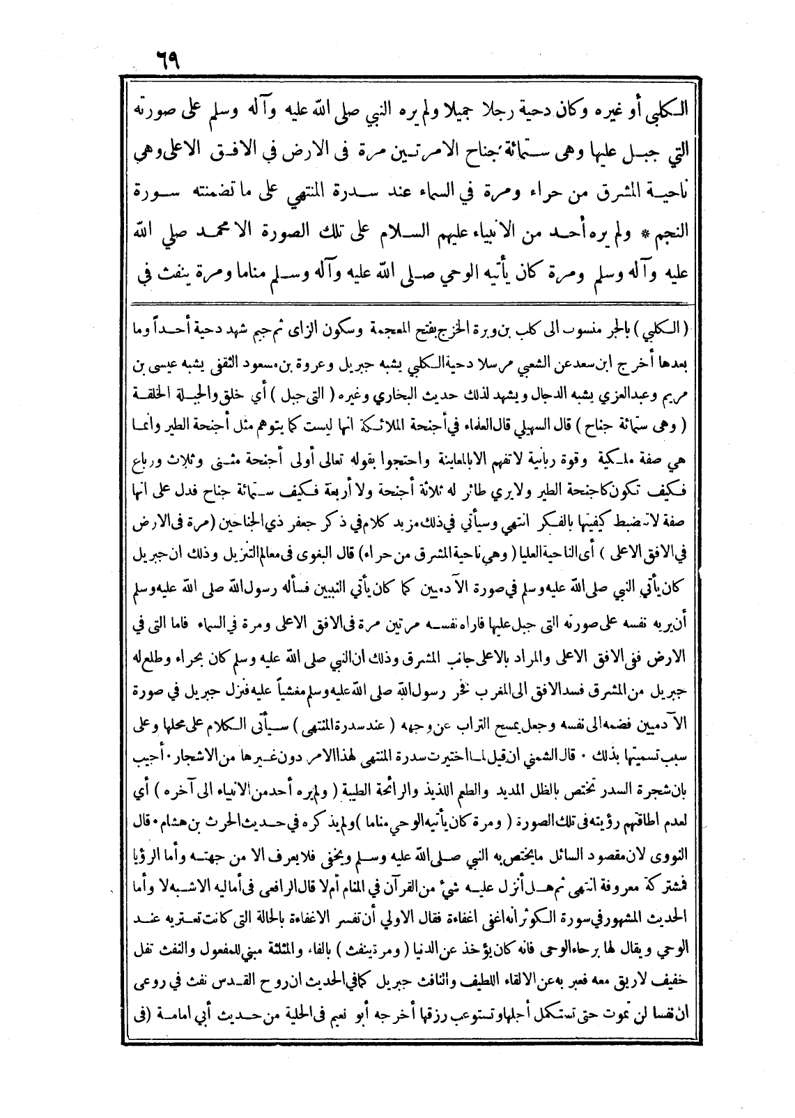 الكلبى أو غيره وكان دحية رجلا جميلا ولم يره النبي صلى الله عليه وآله وسلم على صورته التي جبل عليها وهى ستمائة جناح الامرتين مرة في الارض في الافق الاعلى وهى ناحية المشرق من حراء ومرة في السماء عند سدرة المنتهي على ما تضمنته سورة النجم* ولم يره أحد من الانبياء عليهم السلام على تلك الصورة الا محمد صلى الله عليه وآله وسلم ومرة كان يأتيه الوحي صلى الله عليه وآله وسلم مناما ومرة ينفث في (الكلبي) بالجر منسوب الى كلب بن وبرة الخزج بفتح المعجمة وسكون الزاى ثم جيم شهد دحية أحدا وما بعدها أخرج ابن سعد عن الشعبي مرسلا دحية الكلبي يشبه جبريل وعروة بن مسعود الثقفى يشبه عيسى بن مريم وعبد العزى يشبه الدجال ويشهد لذلك حديث البخاري وغيره (التى جبل) أي خلق والجبلة الخلقة (وهى ستمائة جناح) قال السهيلي قال العلماء في أجنحة الملائكة انها ليست كما يتوهم مثل أجنحة الطير وانما هي صفة ملكية وقوة ربانية لا تفهم الا بالمعاينة واحتجوا بقوله تعالى أُولِي أَجْنِحَةٍ مَثْنى وَثُلاثَ وَرُباعَ فكيف تكون كاجنحة الطير ولا يري طائر له ثلاثة أجنحة ولا أربعة فكيف ستمائة جناح فدل على انها صفة لا تنضبط كيفيتها بالفكر انتهي وسيأتي في ذلك مزيد كلام في ذكر جعفر ذي الجناحين (مرة في الارض في الافق الاعلى) أى الناحية العليا (وهى ناحية المشرق من حراء) قال البغوى في معالم التنزيل وذلك ان جبريل كان يأتي النبي صلى الله عليه وسلم في صورة الآدميين كما كان يأتي النبيين فسأله رسول الله صلى الله عليه وسلم أن يريه نفسه على صورته التى جبل عليها فاراه نفسه مرتين مرة في الافق الاعلى ومرة في السماء فاما التى في الارض ففى الافق الاعلى والمراد بالاعلى جانب المشرق وذلك ان النبي صلى الله عليه وسلم كان بحراء وطلع له جبريل من المشرق فسد الافق الى المغرب فخر رسول الله صلى الله عليه وسلم مغشيا عليه فنزل جبريل في صورة الآدميين فضمه الى نفسه وجعل يمسح التراب عن وجهه (عند سدرة المنتهى) سيأتي الكلام على محلها وعلى سبب تسميتها بذلك. قال الشمني ان قيل لما اختيرت سدرة المنتهى لهذا الامر دون غيرها من الاشجار. أجيب بان شجرة السدر تختص بالظل المديد والطعم اللذيذ والرائحة الطيبة (ولم يره أحد من الأنبياء الى آخره) أي لعدم اطاقتهم رؤيته في تلك الصورة (ومرة كان يأتيه الوحي مناما) ولم يذكره في حديث الحرث بن هشام. قال النووى لان مقصود السائل ما يختص به النبي صلى الله عليه وسلم ويخفى فلا يعرف الا من جهته وأما الرؤيا فمشتركة معروفة انتهى ثم هل أنزل عليه شيء من القرآن في المنام أم لا قال الرافعى في أماليه الاشبه لا وأما الحديث المشهور في سورة الكوثر انه اغفى اغفاءة فقال الاولي أن تفسر الاغفاءة بالحالة التى كانت تعتريه عند الوحي ويقال لها برحاء الوحى فانه كان يؤخذ عن الدنيا (ومرة ينفث) بالفاء والمثلثة مبني للمفعول والنفث تفل خفيف لا ريق معه فعبر به عن الالقاء اللطيف والنافث جبريل كما في الحديث ان روح القدس نفث في روعى ان نفسا لن تموت حتى تستكمل أجلها وتستوعب رزقها أخرجه أبو نعيم في الحلية من حديث أبي امامة (فى