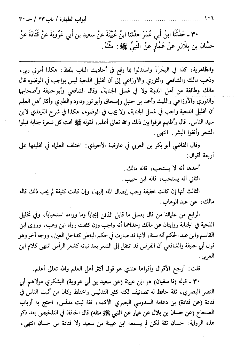 [30] قَوْلُهُ (نا سفيان) هو بن عُيَيْنَةَ (عَنْ سَعِيدِ بْنِ أَبِي عَرُوبَةَ) الْيَشْكُرِيِّ مَوْلَاهُمْ أَبِي النَّضْرِ الْبَصْرِيِّ ثِقَةٌ حَافِظٌ لَهُ تَصَانِيفُ لَكِنَّهُ كَثِيرُ التَّدْلِيسِ وَاخْتَلَطَ وَكَانَ مِنْ أَثْبَتِ النَّاسِ فِي قتادة (عن قتادة) بن دِعَامَةَ السُّدُوسِيِّ الْبَصْرِيِّ الْأَكْمَهِ ثِقَةٌ ثَبْتٌ مُدَلِّسٌ اِحْتَجَّ بِهِ أَرْبَابُ الصِّحَاحِ (عَنْ حَسَّانِ بْنِ بِلَالٍ عَنْ عَمَّارٍ عَنْ النَّبِيِّ صَلَّى اللَّهُ عَلَيْهِ وَسَلَّمَ مِثْلَهُ) قَالَ الْحَافِظُ فِي التَّلْخِيصِ بَعْدَ ذِكْرِ هَذِهِ الرِّوَايَةِ حَسَّانُ ثِقَةٌ لَكِنْ لم يسمعه بن عُيَيْنَةَ مِنْ سَعِيدٍ وَلَا قَتَادَةُ مِنْ حَسَّانٍ انتهى