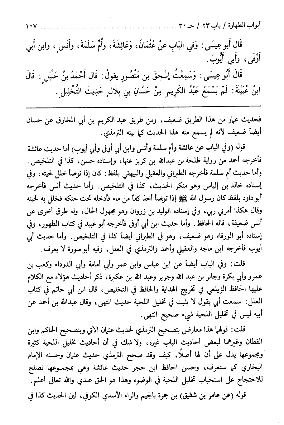 قُلْتُ وَفِي الْبَابِ أيضا عن بن عباس وبن عُمَرَ وَأَبِي أُمَامَةَ وَأَبِي الدَّرْدَاءِ وَكَعْبِ بْنِ عَمْرٍو وَأَبِي بَكْرَةَ وَجَابِرِ بْنِ عَبْدِ اللَّهِ وَجَرِيرٍ وَعَبْدِ اللَّهِ بْنِ عُكْبَرَةَ ذَكَرَ أَحَادِيثَ هَؤُلَاءِ مَعَ الْكَلَامِ عَلَيْهَا الْحَافِظُ الزَّيْلَعِيُّ فِي تخريج الهداية والحافظ في التلخيص قال بن أَبِي حَاتِمٍ فِي كِتَابِ الْعِلَلِ سَمِعْتُ أَبِي يَقُولُ لَا يَثْبُتُ فِي تَخْلِيلِ اللِّحْيَةِ حَدِيثٌ انْتَهَى وَقَالَ عَبْدُ اللَّهِ بْنُ أَحْمَدَ عَنْ أَبِيهِ لَيْسَ فِي تَخْلِيلِ اللِّحْيَةِ شَيْءٌ صَحِيحٌ انْتَهَى