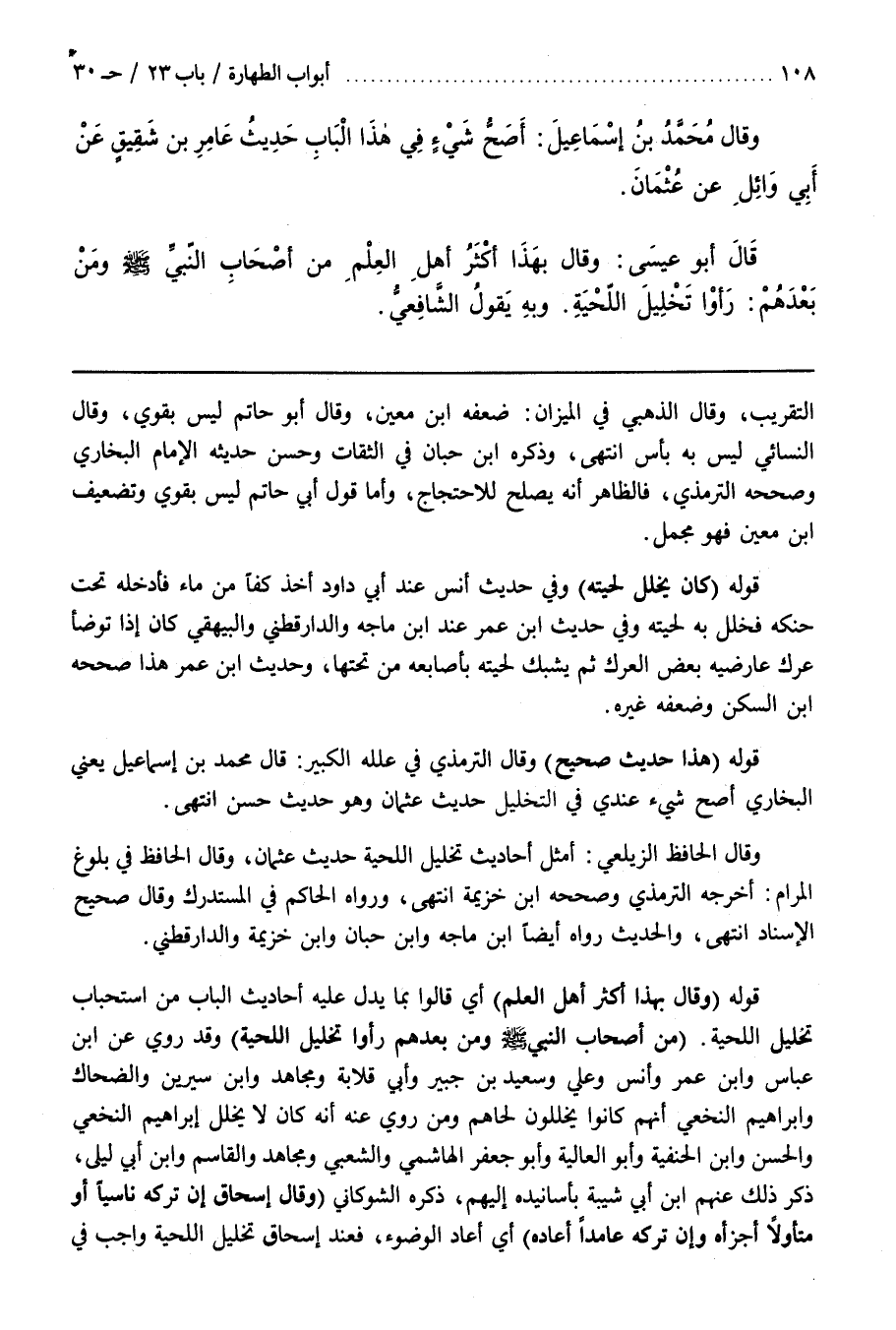 وَقَالَ الْحَافِظُ الزَّيْلَعِيُّ أَمْثَلُ أَحَادِيثِ تَخْلِيلِ اللِّحْيَةِ حَدِيثُ عُثْمَانَ وَقَالَ الْحَافِظُ فِي بُلُوغِ الْمَرَامِ أَخْرَجَهُ الترمذي وصححه بن خُزَيْمَةَ انْتَهَى وَرَوَاهُ الْحَاكِمُ فِي الْمُسْتَدْرَكِ وَقَالَ صحيح الإسناد انتهى والحديث رواه أيضا بن ماجه وبن حبان وبن خُزَيْمَةَ والدَّارَقُطْنِيُّ