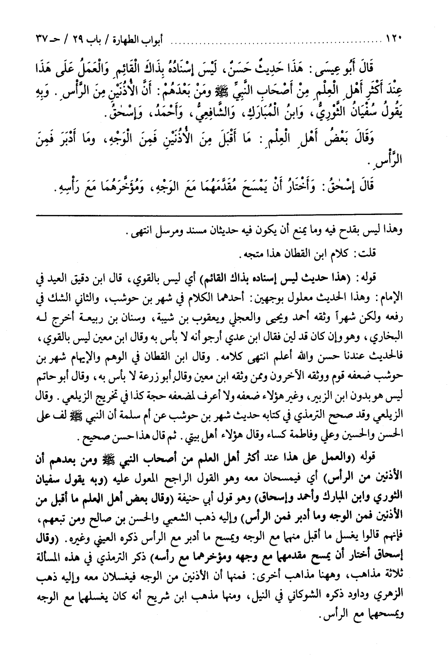 قَوْلُهُ (وَالْعَمَلُ عَلَى هَذَا عِنْدَ أَكْثَرِ أَهْلِ الْعِلْمِ مِنْ أَصْحَابِ النَّبِيِّ صَلَّى اللَّهُ عَلَيْهِ وَسَلَّمَ وَمَنْ بَعْدَهُمْ أَنَّ الْأُذُنَيْنِ مِنَ الرَّأْسِ) أَيْ فَيُمْسَحَانِ مَعَهُ وَهُوَ الْقَوْلُ الرَّاجِحُ الْمُعَوَّلُ عَلَيْهِ (به يقول سفيان الثوري وبن المبارك وأحمد وَإِسْحَاقُ) وَهُوَ قَوْلُ أَبِي حَنِيفَةَ (وَقَالَ بَعْضُ أَهْلِ الْعِلْمِ مَا أَقْبَلَ مِنَ الْأُذُنَيْنِ فَمِنَ الْوَجْهِ وَمَا أَدْبَرَ فَمِنَ الرَّأْسِ) وَإِلَيْهِ ذَهَبَ الشَّعْبِيُّ وَالْحَسَنُ بْنُ صَالِحٍ وَمَنْ تَبِعَهُمْ فَإِنَّهُمْ قَالُوا يَغْسِلُ مَا أَقْبَلَ مِنْهُمَا مَعَ الْوَجْهِ وَيَمْسَحُ مَا أَدْبَرَ مَعَ الرَّأْسِ ذَكَرَهُ الْعَيْنِيُّ وَغَيْرُهُ (وَقَالَ إِسْحَاقُ أَخْتَارُ أَنْ يَمْسَحَ مُقَدَّمَهُمَا مَعَ وَجْهِهِ وَمُؤَخَّرَهُمَا مَعَ رَأْسِهِ) ذَكَرَ التِّرْمِذِيُّ فِي هَذِهِ الْمَسْأَلَةِ ثَلَاثَةَ مَذَاهِبَ وههنا مَذَاهِبُ أُخْرَى فَمِنْهَا أَنَّ الْأُذُنَيْنِ مِنَ الْوَجْهِ فَيُغْسَلَانِ مَعَهُ وَإِلَيْهِ ذَهَبَ الزُّهْرِيُّ وَدَاوُدُ ذَكَرَهُ الشوكاني في النيل ومنها مذهب بن شُرَيْحٍ أَنَّهُ كَانَ يَغْسِلُهُمَا مَعَ الْوَجْهِ وَيَمْسَحُهُمَا مع الرأس