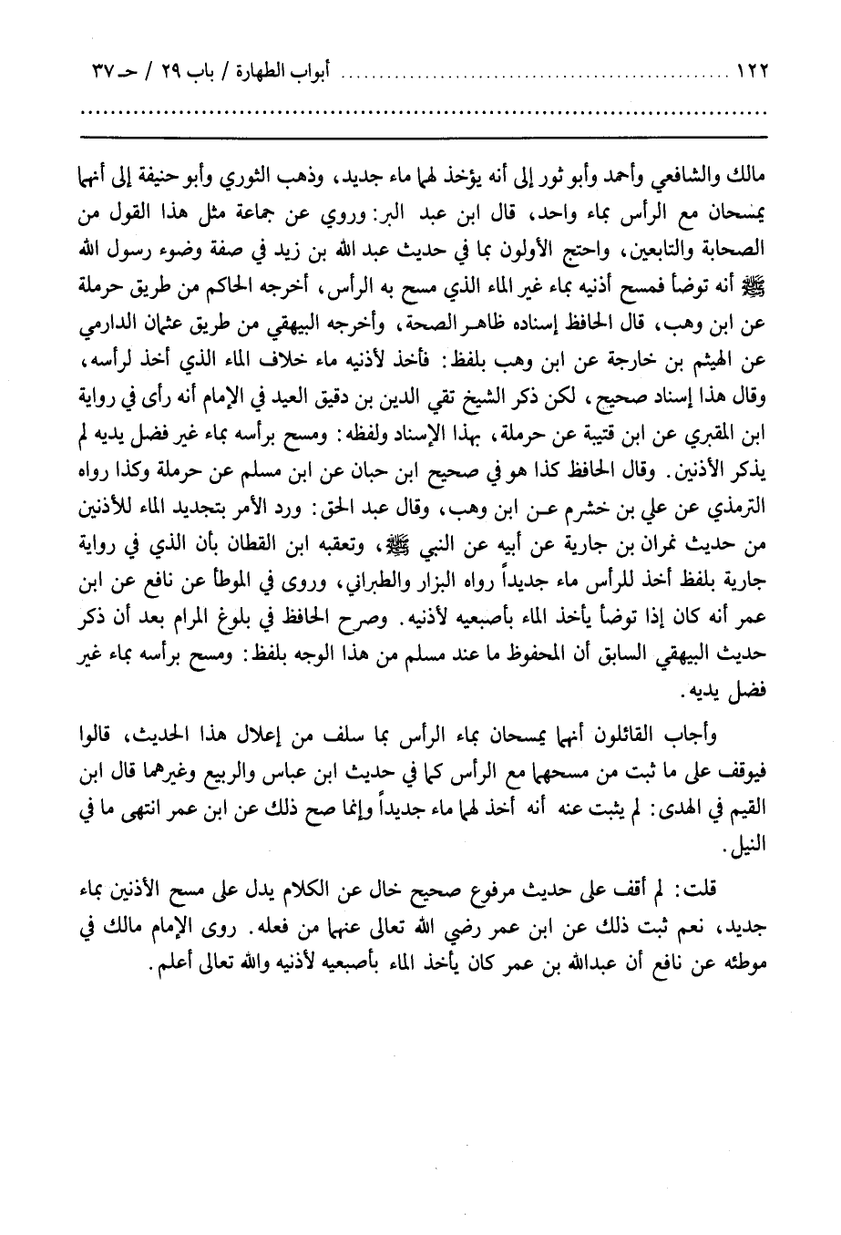 وَرُوِيَ عَنْ جَمَاعَةٍ مِثْلُ هَذَا الْقَوْلِ مِنَ الصَّحَابَةِ وَالتَّابِعِينَ وَاحْتَجَّ الْأَوَّلُونَ بِمَا فِي حَدِيثِ عَبْدِ اللَّهِ بْنِ زَيْدٍ فِي صِفَةِ وُضُوءِ رَسُولِ اللَّهِ صَلَّى اللَّهُ عَلَيْهِ وَسَلَّمَ أَنَّهُ تَوَضَّأَ فَمَسَحَ أُذُنَيْهِ بِمَاءٍ غَيْرِ الْمَاءِ الَّذِي مَسَحَ بِهِ الرَّأْسَ أَخْرَجَهُ الْحَاكِمُ من طريق حرملة عن بن وَهْبٍ قَالَ الْحَافِظُ إِسْنَادُهُ ظَاهِرُ الصِّحَّةِ وَأَخْرَجَهُ الْبَيْهَقِيُّ مِنْ طَرِيقِ عُثْمَانَ الدَّارِمِيِّ عَنِ الْهَيْثَمِ بن خارجة عن بن وَهْبٍ بِلَفْظِ فَأَخَذَ لِأُذُنَيْهِ مَاءً خِلَافَ الْمَاءِ الَّذِي أَخَذَ لِرَأْسِهِ وَقَالَ هَذَا إِسْنَادٌ صَحِيحٌ لَكِنْ ذَكَرَ الشَّيْخُ تَقِيُّ الدِّينِ بْنُ دَقِيقِ الْعِيدِ فِي الْإِمَامِ أَنَّهُ رَأَى فِي رِوَايَةِ بن المقبري عن بن قُتَيْبَةَ عَنْ حَرْمَلَةَ بِهَذَا الْإِسْنَادِ وَلَفْظُهُ وَمَسَحَ بِرَأْسِهِ بِمَاءٍ غَيْرِ فَضْلِ يَدَيْهِ لَمْ يَذْكُرْ الْأُذُنَيْنِ