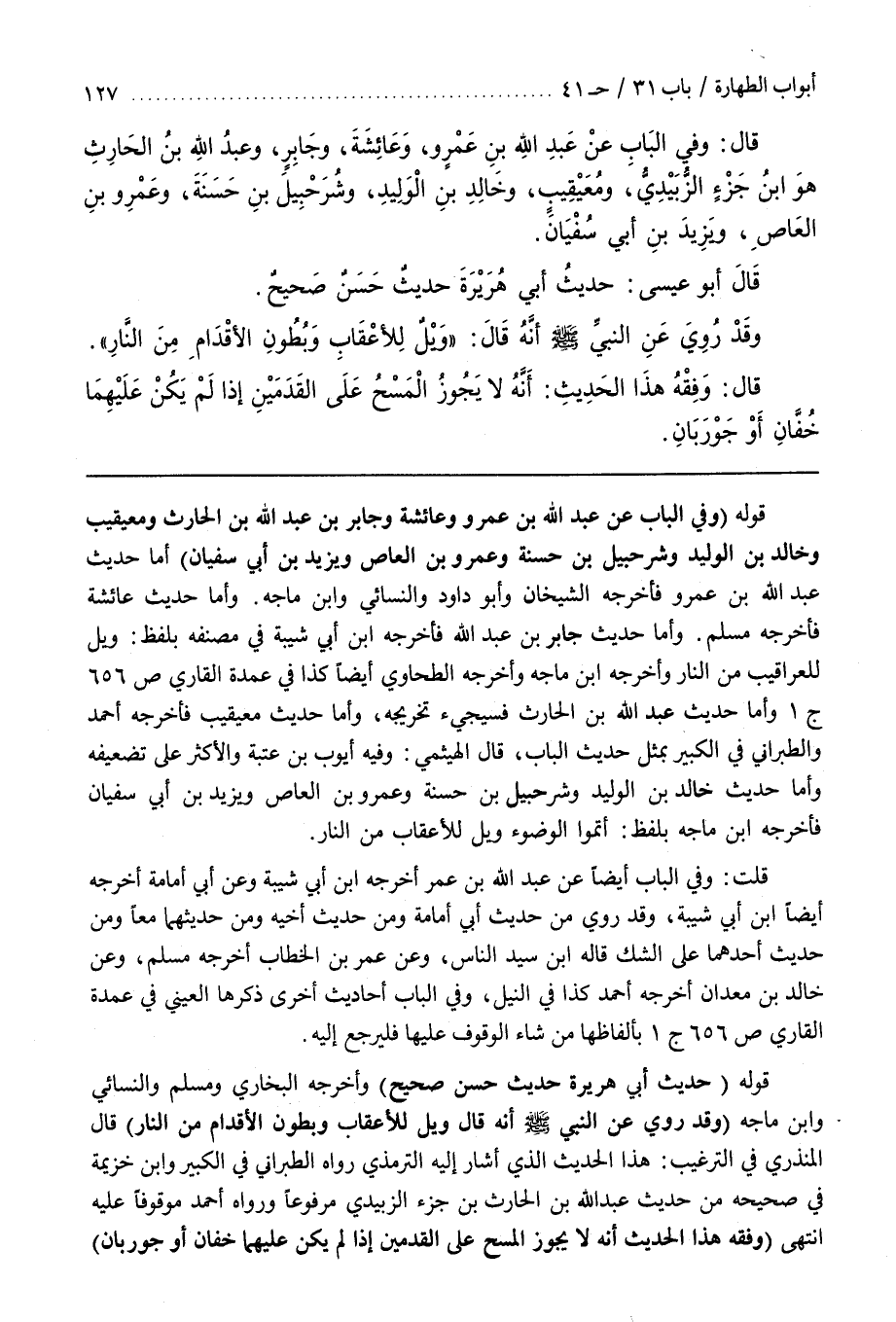 قَوْلُهُ (حَدِيثُ أَبِي هُرَيْرَةَ حَدِيثٌ حَسَنٌ صَحِيحٌ) وَأَخْرَجَهُ البخاري ومسلم والنسائي وبن مَاجَهْ (وَقَدْ رُوِيَ عَنِ النَّبِيِّ صَلَّى اللَّهُ عَلَيْهِ وَسَلَّمَ أَنَّهُ قَالَ وَيْلٌ لِلْأَعْقَابِ وَبُطُونِ الْأَقْدَامِ مِنَ النَّارِ) قَالَ الْمُنْذِرِيُّ فِي التَّرْغِيبِ هَذَا الْحَدِيثُ الَّذِي أَشَارَ إِلَيْهِ التِّرْمِذِيُّ رَوَاهُ الطبراني في الكبير وبن خُزَيْمَةَ فِي صَحِيحِهِ مِنْ حَدِيثِ عَبْدِ اللَّهِ بْنِ الْحَارِثِ بْنِ جُزْءٍ الزُّبَيْدِيِّ مَرْفُوعًا وَرَوَاهُ أَحْمَدُ مَوْقُوفًا عَلَيْهِ انْتَهَى (وَفِقْهُ هَذَا الْحَدِيثِ أَنَّهُ لَا يَجُوزُ الْمَسْحُ عَلَى الْقَدَمَيْنِ إِذَا لَمْ يَكُنْ عَلَيْهِمَا خُفَّانِ أَوْ جَوْرَبَانِ