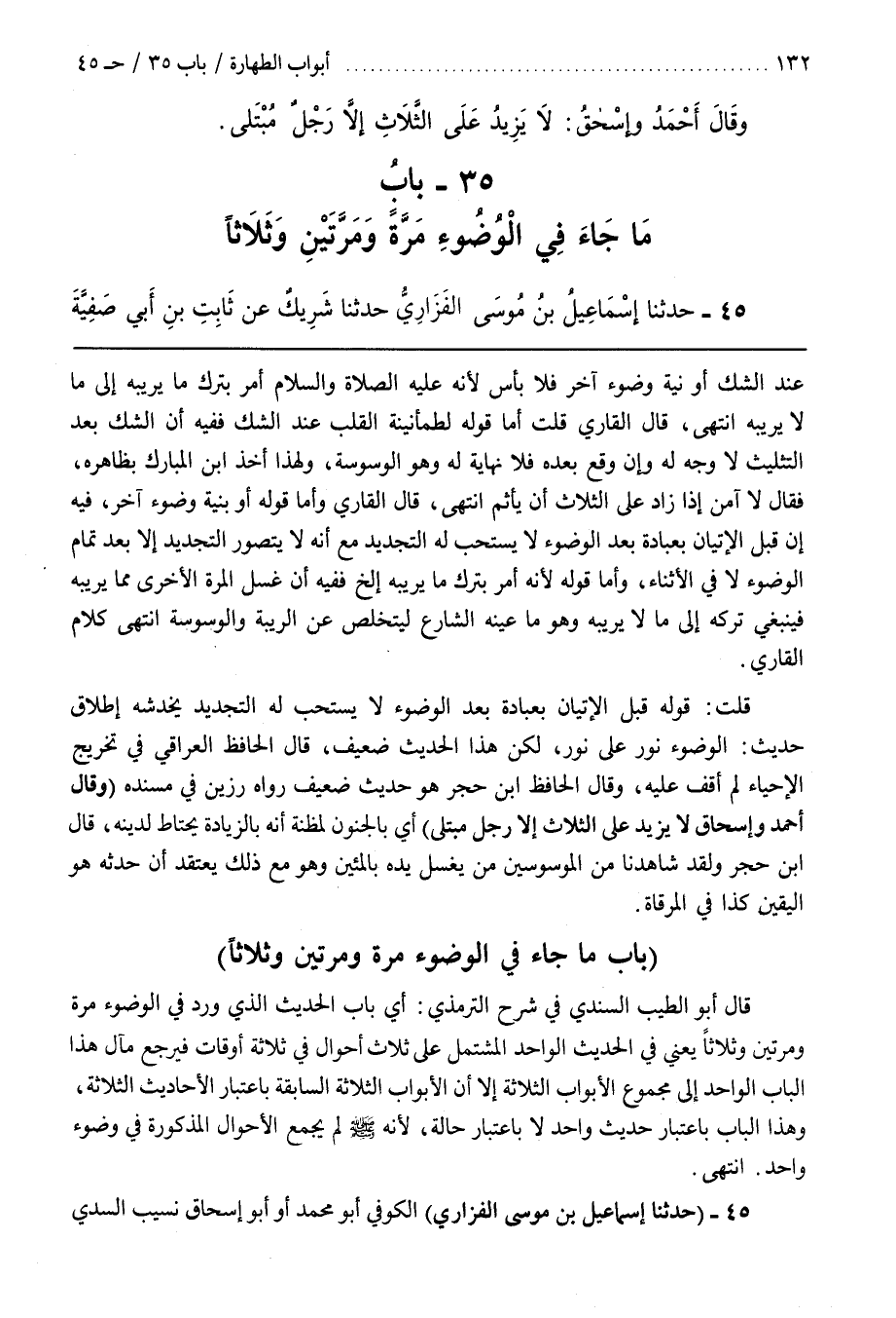 قُلْتُ قَوْلُهُ قَبْلَ الْإِتْيَانِ بِعِبَادَةٍ بَعْدَ الْوُضُوءِ لَا يُسْتَحَبُّ لَهُ التَّجْدِيدُ يَخْدِشُهُ إِطْلَاقُ حَدِيثِ الْوُضُوءُ عَلَى الْوُضُوءِ نُورٌ عَلَى نُورٍ لَكِنَّ هَذَا الْحَدِيثَ ضَعِيفٌ قَالَ الْحَافِظُ الْعِرَاقِيُّ فِي تَخْرِيجِ الْإِحْيَاءِ لَمْ أَقِفْ عَلَيْهِ وَقَالَ الْحَافِظُ بن حَجَرٍ هُوَ حَدِيثٌ ضَعِيفٌ رَوَاهُ رَزِينٌ فِي مسنده (وقال أحمد وإسحاق لا يزيد الثَّلَاثَ إِلَّا رَجُلٌ مُبْتَلًى) أَيْ بِالْجُنُونِ لِمَظِنَّةِ أنه بالزيادة يحتاط لدينه قال بن حَجَرٍ وَلَقَدْ شَاهَدْنَا مِنَ الْمُوَسْوِسِينَ مَنْ يَغْسِلُ يَدَهُ بِالْمِئِينَ وَهُوَ مَعَ ذَلِكَ يَعْتَقِدُ أَنَّ حَدَثَهُ هُوَ الْيَقِينُ كَذَا فِي الْمِرْقَاةِ