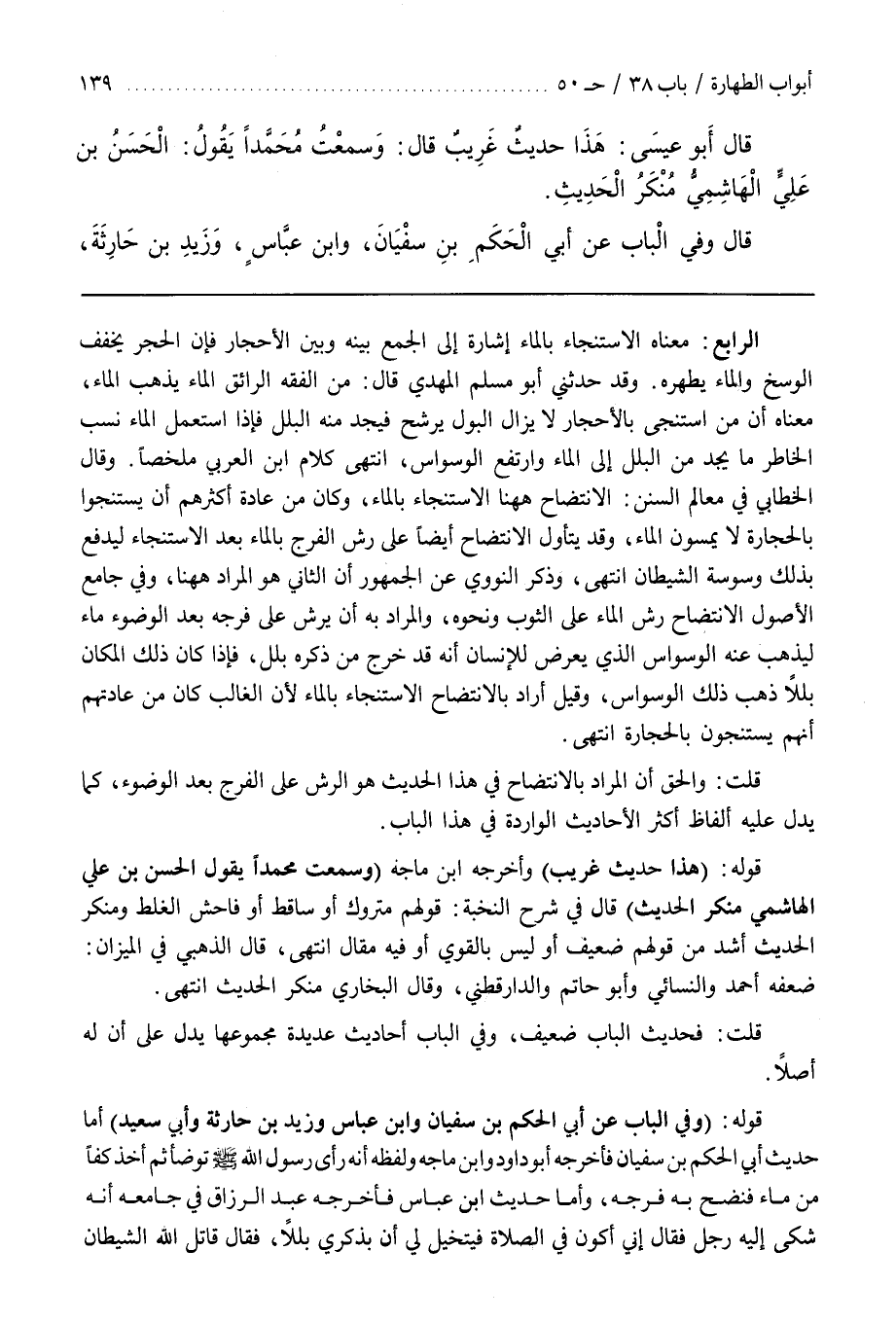قَوْلُهُ (وَفِي الْبَابِ عَنْ أَبِي الْحَكَمِ بْنِ سفيان وبن عَبَّاسٍ وَزَيْدِ بْنِ حَارِثَةَ وَأَبِي سَعِيدٍ) أَمَّا حَدِيثُ الْحَكَمِ بْنِ سُفْيَانَ فَأَخْرَجَهُ أَبُو دَاوُدَ وبن مَاجَهْ وَلَفْظُهُ أَنَّهُ رَأَى رَسُولَ اللَّهِ صَلَّى اللَّهُ عَلَيْهِ وَسَلَّمَ تَوَضَّأَ ثُمَّ أَخَذَ كَفًّا مِنْ مَاءٍ فَنَضَحَ بِهِ فَرْجَهُ وَأَمَّا حَدِيثُ بن عَبَّاسٍ فَأَخْرَجَهُ عَبْدُ الرَّزَّاقِ فِي جَامِعِهِ أَنَّهُ شكى إِلَيْهِ رَجُلٌ فَقَالَ إِنِّي أَكُونُ فِي الصَّلَاةِ فَيُتَخَيَّلُ لِي أَنَّ بِذَكَرِي بَلَلًا فَقَالَ قَاتَلَ الله الشيطان
