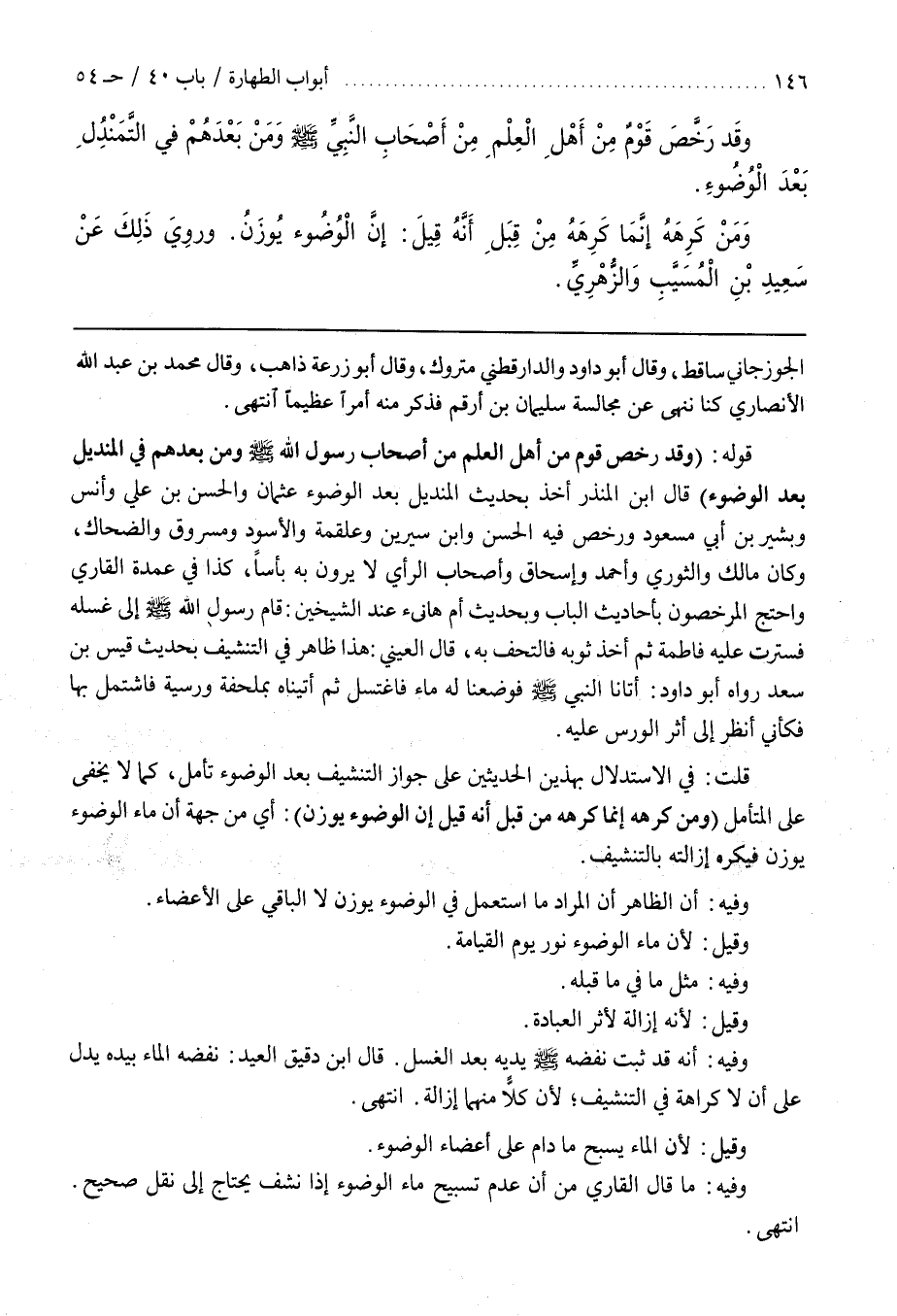 وَفِيهِ مَا قال القارىء مِنْ أَنَّ عَدَمَ تَسْبِيحِ مَاءِ الْوُضُوءِ إِذَا نُشِّفَ يَحْتَاجُ إِلَى نَقْلٍ صَحِيحٍ
