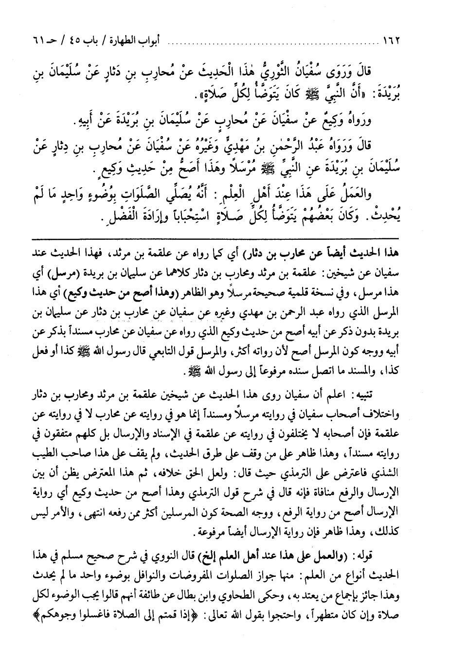 تَنْبِيهٌ اعْلَمْ أَنَّ سُفْيَانَ رَوَى هَذَا الْحَدِيثَ عَنْ شَيْخَيْنِ عَلْقَمَةَ بْنِ مَرْثَدٍ وَمُحَارِبِ بْنِ دِثَارٍ وَاخْتِلَافُ أَصْحَابِ سُفْيَانَ فِي رِوَايَتِهِ مُرْسَلًا وَمُسْنَدًا إِنَّمَا هُوَ فِي رِوَايَتِهِ عَنْ مُحَارِبٍ لَا فِي رِوَايَتِهِ عَنْ عَلْقَمَةَ فَإِنَّ أَصْحَابَهُ لَا يَخْتَلِفُونَ فِي رِوَايَتِهِ عَنْ عَلْقَمَةَ فِي الْإِسْنَادِ وا رسال بَلْ كُلُّهُمْ مُتَّفِقُونَ فِي رِوَايَتِهِ مُسْنَدًا وَهَذَا ظَاهِرٌ عَلَى مَنْ وَقَفَ عَلَى طُرُقِ الْحَدِيثِ وَلَمْ يَقِفْ عَلَى هَذَا صَاحِبُ الطِّيبِ الشَّذِيِّ فَاعْتَرَضَ عَلَى التِّرْمِذِيِّ حَيْثُ قَالَ وَلَعَلَّ الْحَقَّ خِلَافُهُ ثُمَّ هَذَا الْمُعْتَرِضُ يَظُنُّ أَنَّ بَيْنَ الْإِرْسَالِ وَالرَّفْعِ مُنَافَاةً فَإِنَّهُ قَالَ فِي شَرْحِ قَوْلِ التِّرْمِذِيِّ وَهَذَا أَصَحُّ مِنْ حَدِيثِ وَكِيعٍ أَيْ رِوَايَةُ الْإِرْسَالِ أَصَحُّ مِنْ رِوَايَةِ الرَّفْعِ وجه الصِّحَّةِ كَوْنُ الْمُرْسِلِينَ أَكْثَرَ مِمَّنْ رَفَعَهُ انْتَهَى وَالْأَمْرُ لَيْسَ كَذَلِكَ وَهَذَا ظَاهِرٌ فَإِنَّ رِوَايَةَ الْإِرْسَالِ أَيْضًا مَرْفُوعَةٌ
