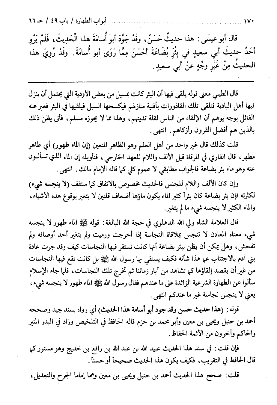 قَالَ الْعَلَّامَةُ الشَّاهُ ولي الله الدهلوي في حجة الله البالغة قَوْلُهُ صَلَّى اللَّهُ عَلَيْهِ وَسَلَّمَ الْمَاءُ طَهُورٌ لَا يُنَجِّسُهُ شَيْءٌ مَعْنَاهُ الْمَعَادِنُ لَا تُنَجَّسُ بِمُلَاقَاةِ النَّجَاسَةِ إِذَا أُخْرِجَتْ وَرُمِيَتْ وَلَمْ يَتَغَيَّرْ أَحَدُ أَوْصَافِهِ وَلَمْ تَفْحُشْ وَهَلْ يُمْكِنُ أَنْ يُظَنَّ بِبِئْرِ بُضَاعَةَ أَنَّهَا كَانَتْ تَسْتَقِرُّ فِيهَا النَّجَاسَاتُ كَيْفَ وَقَدْ جَرَتْ عَادَةُ بَنِي آدَمَ بِالِاجْتِنَابِ عَمَّا هَذَا شَأْنُهُ فَكَيْفَ يَسْتَقِي بِهَا رَسُولُ اللَّهِ صَلَّى اللَّهُ عَلَيْهِ وَسَلَّمَ بَلْ كَانَتْ تَقَعُ فِيهَا النَّجَاسَاتُ مِنْ غَيْرِ أَنْ يُقْصَدَ إِلْقَاؤُهَا كَمَا تُشَاهِدُ مِنْ آبَارِ زَمَانِنَا ثُمَّ تَخْرُجُ تِلْكَ النَّجَاسَاتُ فَلَمَّا جَاءَ الْإِسْلَامُ سَأَلُوا عَنِ الطَّهَارَةِ الشَّرْعِيَّةِ الزَّائِدَةِ عَلَى مَا عِنْدَهُمْ فَقَالَ رَسُولُ اللَّهِ صَلَّى اللَّهُ عَلَيْهِ وَسَلَّمَ الْمَاءُ طَهُورٌ لَا يُنَجِّسُهُ شَيْءٌ يَعْنِي لَا يُنَجَّسُ نَجَاسَةَ غَيْرَ مَا عِنْدَكُمْ انْتَهَى