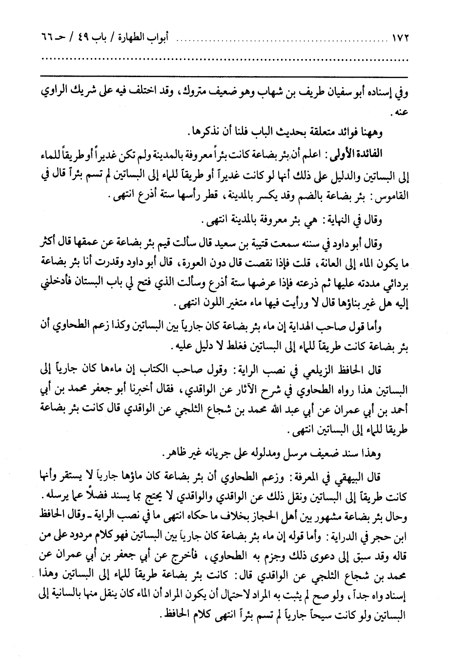 وَأَمَّا قَوْلُهُ إِنَّ مَاءَ بِئْرِ بُضَاعَةَ كَانَ جَارِيًا بَيْنَ الْبَسَاتِينِ فَهُوَ كَلَامٌ مَرْدُودٌ عَلَى مَنْ قَالَهُ وَقَدْ سَبَقَ إِلَى دَعْوَى ذَلِكَ وَجَزَمَ بِهِ الطَّحَاوِيُّ فَأَخْرَجَ عَنْ أَبِي جَعْفَرِ بْنِ أَبِي عِمْرَانَ عَنْ مُحَمَّدِ بْنِ شُجَاعٍ الثَّلْجِيِّ عَنِ الْوَاقِدِيِّ قَالَ كَانَتْ بِئْرُ بُضَاعَةَ طَرِيقًا لِلْمَاءِ إِلَى الْبَسَاتِينِ وَهَذَا إِسْنَادٌ وَاهٍ جِدًّا وَلَوْ صَحَّ لَمْ يَثْبُتْ بِهِ الْمُرَادُ لِاحْتِمَالِ أَنْ يَكُونَ الْمُرَادُ أَنَّ الْمَاءَ كَانَ يُنْقَلُ مِنْهَا بِالسَّانِيَةِ إِلَى الْبَسَاتِينِ وَلَوْ كَانَتْ سَيْحًا جَارِيًا لَمْ تُسَمَّ بِئْرًا انْتَهَى كَلَامُ الْحَافِظِ