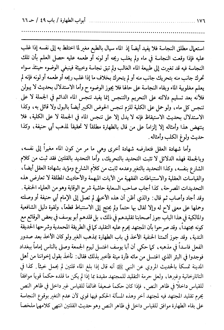 وَقَدْ أَجَادَ وَأَصَابَ ثُمَّ قَالَ وَالَّذِي أَظُنُّ أَنَّ هَذِهِ الْأَخْبَارَ لَمْ تَصِلْ إِلَى الْإِمَامِ أَبِي حَنِيفَةَ أَوْ وَصَلَتْهُ وَحَمَلَهَا عَلَى مَعْنًى لَاحَ لَهُ وَإِلَّا لَقَالَ بِهَا حَتْمًا وَلَمْ يَحْتَجْ إِلَى الِاسْتِنْبَاطِ قَطْعًا وَلِقُوَّةِ دَلِيلِ الشَّافِعِيَّةِ وَالْمَالِكِيَّةِ فِي هَذَا الْبَابِ جَوَّزَ أَصْحَابُنَا تَقْلِيدَهُمْ فِي ذَلِكَ بَلْ قَلَّدَهُمْ أَبُو يُوسُفَ فِي بَعْضِ الْوَقَائِعِ مَعَ كَوْنِهِ مُجْتَهِدًا وَقَدْ صَرَّحُوا بِأَنَّ الْمُجْتَهِدَ يَحْرُمُ عَلَيْهِ التَّقْلِيدُ كَمَا فِي الطَّرِيقَةِ الْمُحَمَّدِيَّةِ وَشَرْحِهَا الْحَدِيقَةِ النَّدِيَّةِ وَقَدْ جَوَّزَ أَئِمَّتُنَا الْحَنَفِيَّةُ الْأَخْذَ فِي بَابِ الطَّهَارَةِ بِمَذْهَبِ الْغَيْرِ وَلَوْ كَانَ الْأَخْذُ بَعْدَ صُدُورِ الْفِعْلِ فَاسِدًا فِي مَذْهَبِهِ كَمَا حُكِيَ أَنَّ أَبَا يُوسُفَ اغْتَسَلَ لِيَوْمِ الْجُمُعَةِ وَصَلَّى بِالنَّاسِ إِمَامًا بِبَغْدَادَ فَوَجَدُوا فِي الْبِئْرِ الَّذِي اغْتَسَلَ مِنْ مَائِهِ فَأْرَةً مَيِّتَةً فَأُخْبِرَ بِذَلِكَ فَقَالَ نَأْخُذُ بِقَوْلِ إِخْوَانِنَا مِنْ أَهْلِ الْمَدِينَةِ تَمَسُّكًا بِالْحَدِيثِ الْمَرْوِيِّ عَنِ النَّبِيِّ صَلَّى اللَّهُ عَلَيْهِ وَسَلَّمَ أَنَّهُ قَالَ إِذَا بَلَغَ الْمَاءُ قلتين لم يحمل خبثا