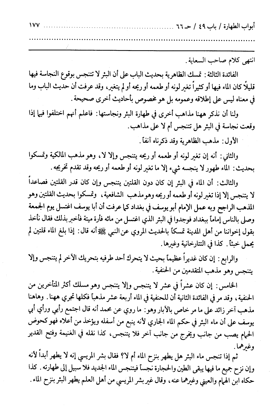 الْفَائِدَةُ الثَّالِثَةُ تَمَسَّكَ الظَّاهِرِيَّةُ بِحَدِيثِ الْبَابِ عَلَى أَنَّ الْبِئْرَ لَا تَتَنَجَّسُ بِوُقُوعِ النَّجَاسَةِ فِيهَا قَلِيلًا كَانَ الْمَاءُ فِيهَا أَوْ كَثِيرًا تَغَيَّرَ لَوْنُهُ أَوْ طَعْمُهُ أَوْ رِيحُهُ أَوْ لَمْ يَتَغَيَّرْ وَقَدْ عَرَفْتَ أَنَّ حَدِيثَ الْبَابِ وَمَا فِي مَعْنَاهُ لَيْسَ عَلَى إِطْلَاقِهِ وَعُمُومِهِ بَلْ هُوَ مَخْصُوصٌ بِأَحَادِيثَ أخرى صحيحة