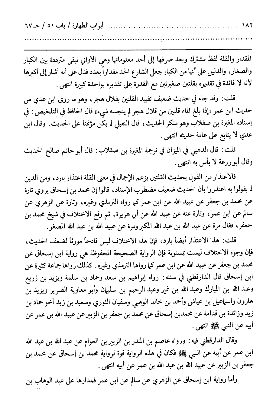 فَالِاعْتِذَارُ مِنَ الْقَوْلِ بِحَدِيثِ الْقُلَّتَيْنِ بِزَعْمِ الْإِجْمَالِ فِي مَعْنَى الْقُلَّةِ اعْتِذَارٌ بَارِدٌ وَمِنَ الَّذِينَ لَمْ يَقُولُوا بِهِ اعْتَذَرُوا بِأَنَّ الْحَدِيثَ ضَعِيفٌ مُضْطَرِبُ الْإِسْنَادِ قَالُوا إِنَّ مُحَمَّدَ بْنَ إِسْحَاقَ يَرْوِي تَارَةً عَنْ مُحَمَّدِ بْنِ جَعْفَرٍ عن عبيد الله عن بن عُمَرَ كَمَا رَوَاهُ التِّرْمِذِيُّ وَغَيْرُهُ وَتَارَةً عَنِ الزهري عن سالم عن بن عُمَرَ وَتَارَةً عَنْهُ عَنْ عُبَيْدِ اللَّهِ عَنْ أَبِي هُرَيْرَةَ ثُمَّ وَقَعَ الِاخْتِلَافُ فِي شَيْخِ مُحَمَّدِ بْنِ جَعْفَرٍ