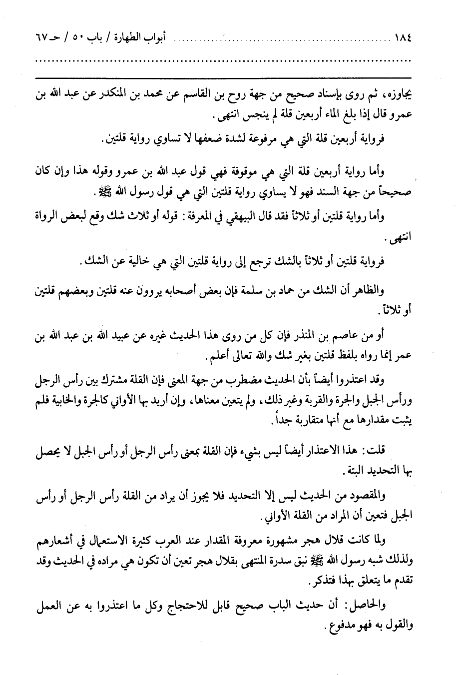 يُجَاوِزْهُ ثُمَّ رَوَى بِإِسْنَادٍ صَحِيحٍ مِنْ جِهَةِ رُوحِ بْنِ الْقَاسِمِ عَنْ مُحَمَّدِ بْنِ الْمُنْكَدِرِ عَنْ عَبْدِ اللَّهِ بْنِ عَمْرٍو قَالَ إِذَا بَلَغَ الْمَاءُ أَرْبَعِينَ قُلَّةً لَمْ يُنَجَّسْ انْتَهَى