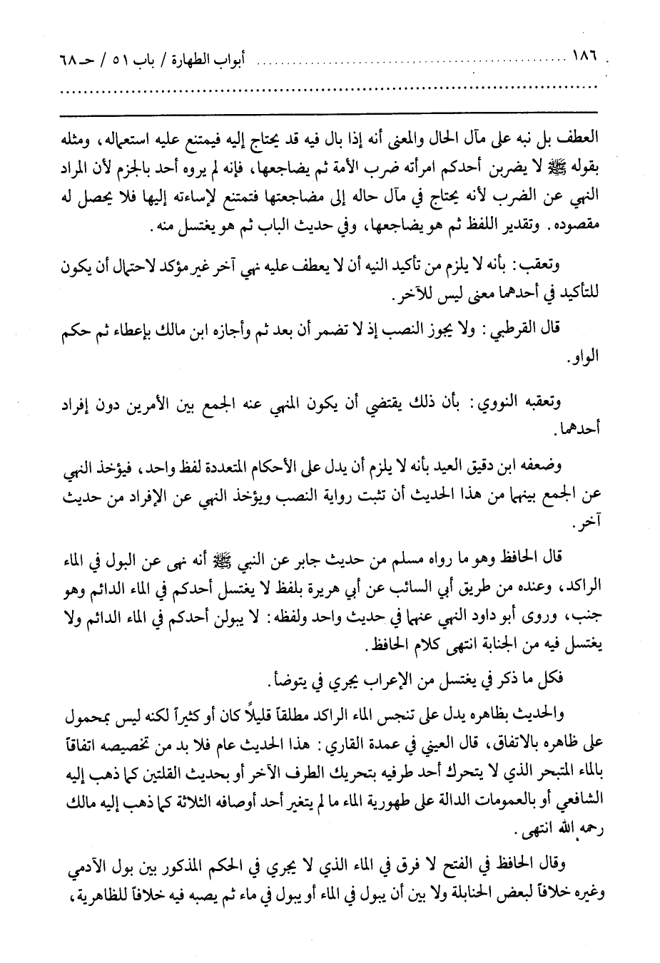 الْعَطْفَ بَلْ نَبَّهَ عَلَى مَآلِ الْحَالِ وَالْمَعْنَى أَنَّهُ إِذَا بَالَ فِيهِ قَدْ يَحْتَاجُ إِلَيْهِ فَيَمْتَنِعُ عَلَيْهِ اسْتِعْمَالُهُ وَمَثَّلَهُ بِقَوْلِهِ صَلَّى اللَّهُ عَلَيْهِ وَسَلَّمَ لَا يَضْرِبَنَّ أَحَدُكُمْ امْرَأَتَهُ ضَرْبَ الْأَمَةِ ثُمَّ يُضَاجِعُهَا فَإِنَّهُ لَمْ يَرْوِهِ أَحَدٌ بِالْجَزْمِ لِأَنَّ الْمُرَادَ النَّهْيُ عَنِ الضَّرْبِ لِأَنَّهُ يَحْتَاجُ فِي مَآلِ حَالِهِ إِلَى مُضَاجَعَتِهَا فَتَمْتَنِعُ لِإِسَاءَتِهِ إِلَيْهَا فَلَا يَحْصُلُ لَهُ مَقْصُودُهُ وَتَقْدِيرُ اللَّفْظِ ثُمَّ هُوَ يُضَاجِعُهَا وَفِي حَدِيثِ الْبَابِ ثُمَّ هُوَ يَغْتَسِلُ مِنْهُ
