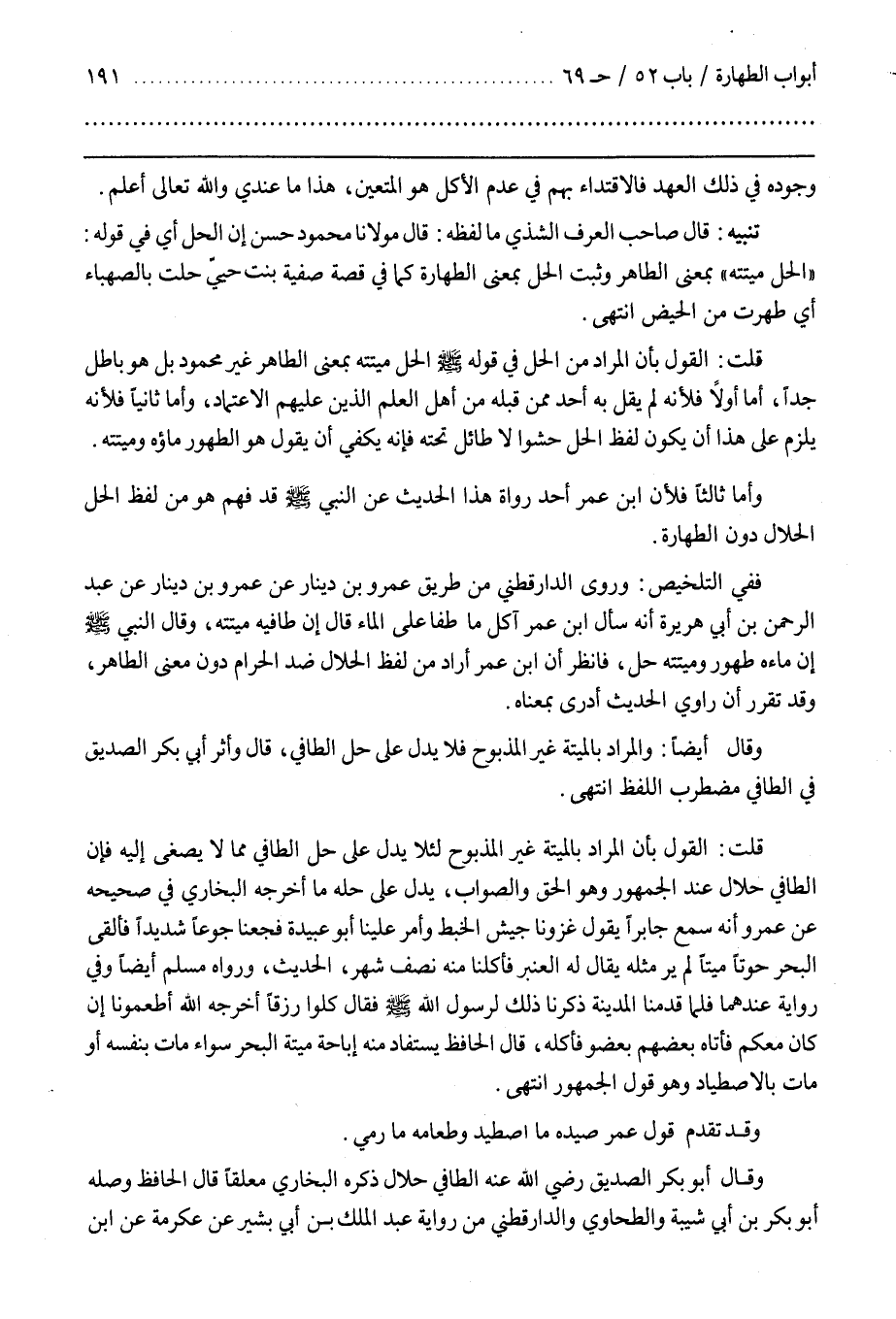تَنْبِيهٌ قال صاحب العرف الشذي ما لفظ قَالَ مَوْلَانَا مَحْمُودُ حَسَنٍ إِنَّ الْحِلَّ أَيْ فِي قَوْلِهِ الْحِلُّ مَيْتَتُهُ بِمَعْنَى الطَّاهِرِ وَثَبَتَ الْحِلُّ بِمَعْنَى الطَّهَارَةِ كَمَا فِي قِصَّةِ صَفِيَّةَ بِنْتِ حُيَيٍّ حَلَّتْ بِالصَّهْبَاءِ أَيْ طَهُرَتْ مِنَ الْحَيْضِ انْتَهَى