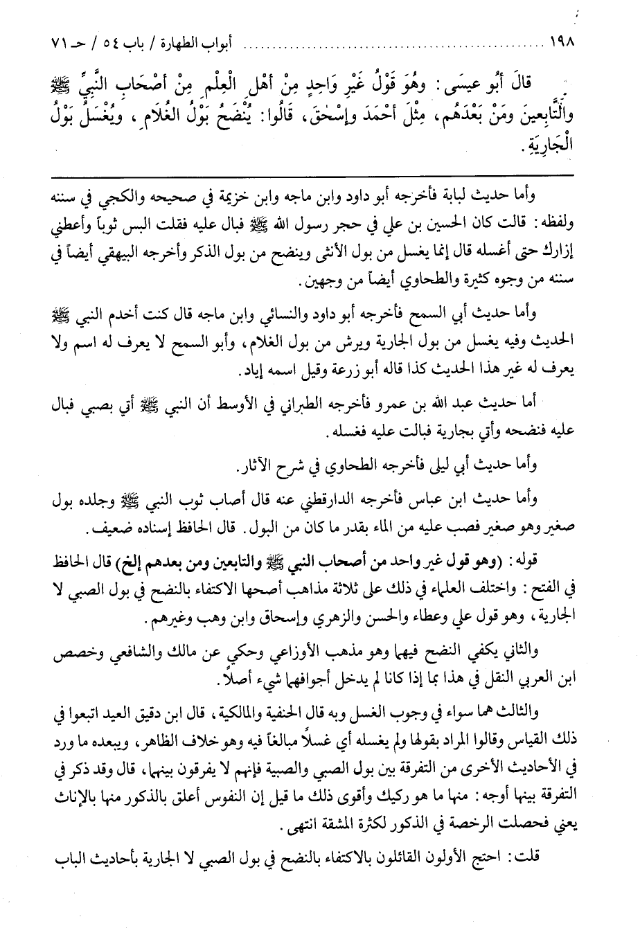 قَوْلُهُ (وَهُوَ قَوْلُ غَيْرِ وَاحِدٍ مِنْ أَصْحَابِ النَّبِيِّ صَلَّى اللَّهُ عَلَيْهِ وَسَلَّمَ وَالتَّابِعِينَ وَمَنْ بَعْدَهُمْ إِلَخْ) قَالَ الْحَافِظُ فِي الْفَتْحِ وَاخْتَلَفَ الْعُلَمَاءُ فِي ذَلِكَ عَلَى ثَلَاثَةِ مَذَاهِبَ أَصَحُّهَا الِاكْتِفَاءُ بِالنَّضْحِ فِي بَوْلِ الصَّبِيِّ لَا الْجَارِيَةِ وَهُوَ قَوْلُ عَلِيٍّ وَعَطَاءٍ وَالْحَسَنِ والزهري وإسحاق وبن وَهْبٍ وَغَيْرِهِمْ
