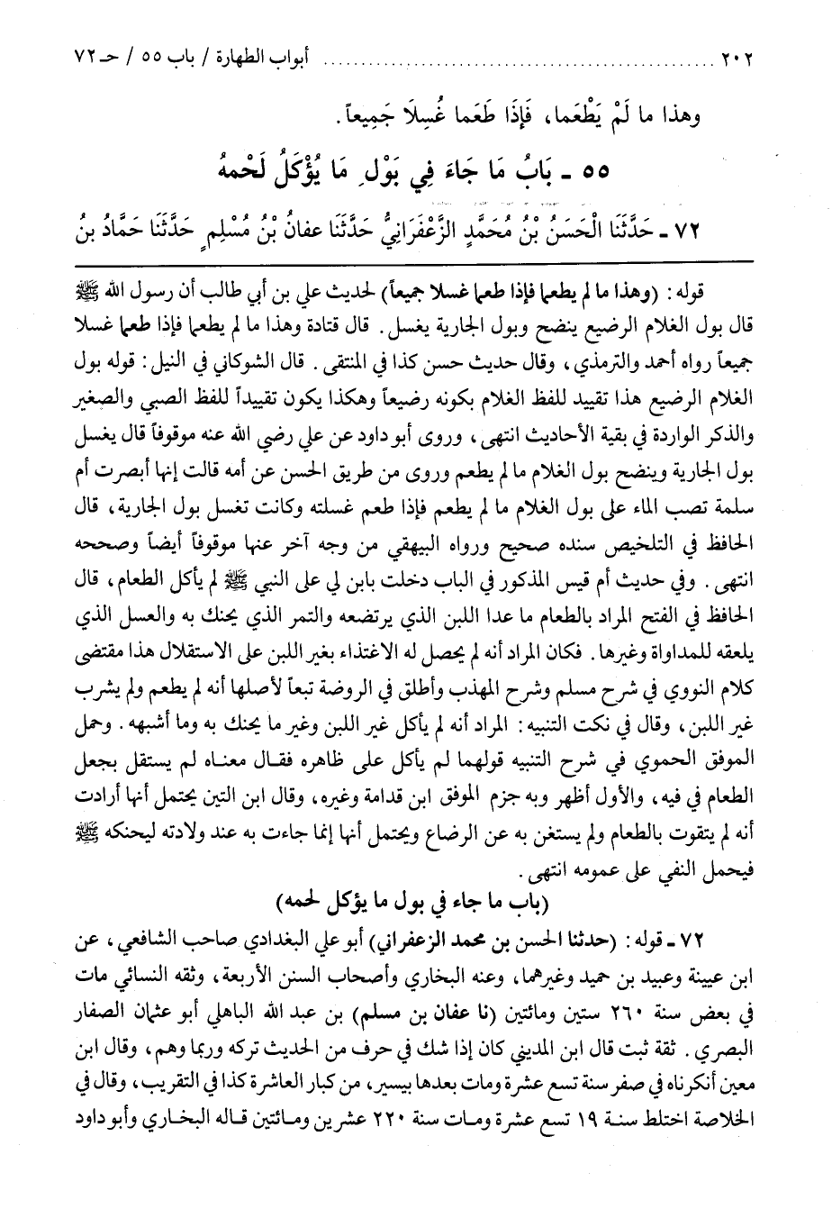 [72] قَوْلُهُ (حَدَّثَنَا الْحَسَنُ بْنُ مُحَمَّدٍ الزَّعْفَرَانِيُّ) أَبُو عَلِيٍّ الْبَغْدَادِيُّ صَاحِبُ الشَّافِعِيِّ عن بن عُيَيْنَةَ وَعُبَيْدِ بْنِ حُمَيْدٍ وَغَيْرِهِمَا وَعَنْهُ الْبُخَارِيُّ وَأَصْحَابُ السُّنَنِ الْأَرْبَعَةِ وَثَّقَهُ النَّسَائِيُّ مَاتَ فِي بَعْضِ سَنَةِ 062 سِتِّينَ وَمِائَتَيْنِ (نَا عَفَّانُ بْنُ مسلم) بن عَبْدِ اللَّهِ الْبَاهِلِيُّ أَبُو عُثْمَانَ الصَّفَّارُ الْبَصْرِيُّ