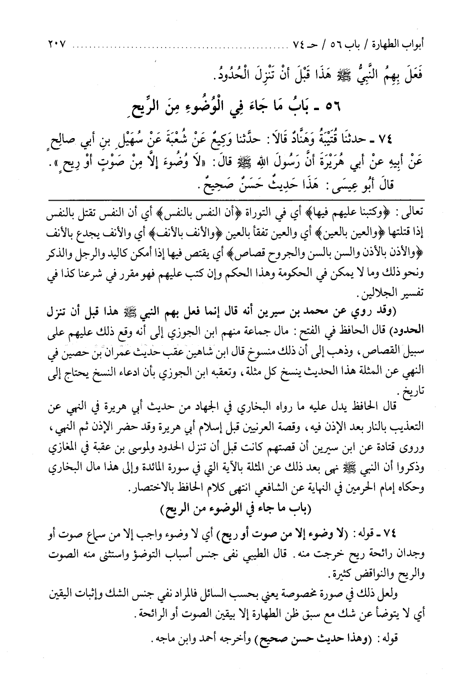 [74] قَوْلُهُ (لَا وُضُوءَ إِلَّا مِنْ صَوْتٍ أَوْ رِيحٍ) أَيْ لَا وُضُوءَ وَاجِبٌ إِلَّا مِنْ سَمَاعِ صَوْتٍ أَوْ وُجْدَانِ رَائِحَةِ رِيحٍ خَرَجَتْ مِنْهُ قَالَ الطِّيبِيُّ نَفَى جِنْسَ أَسْبَابِ التَّوَضُّؤِ وَاسْتَثْنَى مِنْهُ الصَّوْتَ وَالرِّيحَ وَالنَّوَاقِضُ كَثِيرَةٌ