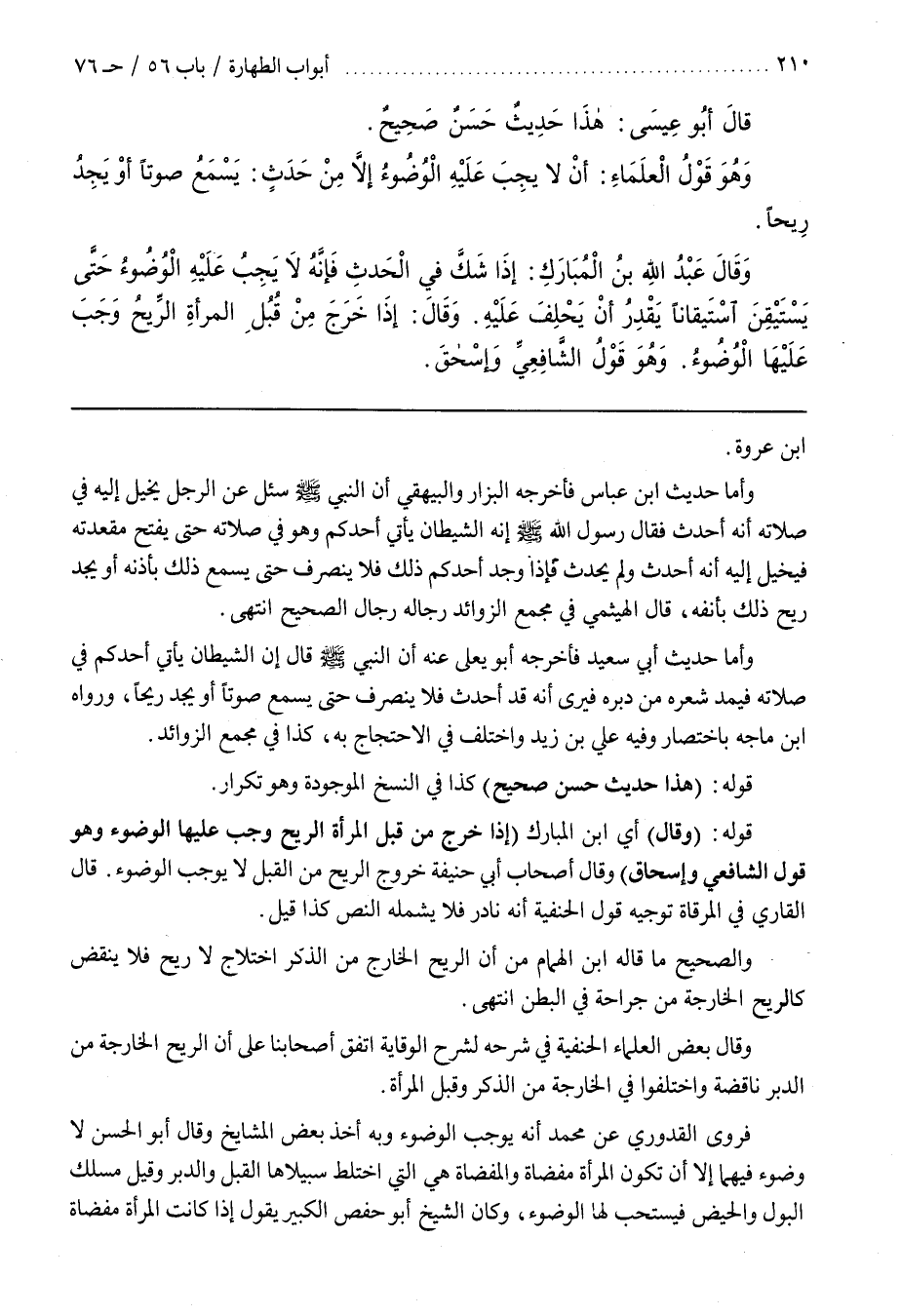 قَوْلُهُ (وَقَالَ) أَيْ بن الْمُبَارَكِ (إِذَا خَرَجَ مِنْ قُبُلِ الْمَرْأَةِ الرِّيحُ وَجَبَ عَلَيْهَا الْوُضُوءُ وَهُوَ قَوْلُ الشَّافِعِيِّ وَإِسْحَاقَ) وَقَالَ أَصْحَابُ أَبِي حَنِيفَةَ خُرُوجُ الرِّيحِ مِنَ القبل لا يوجب الوضوء