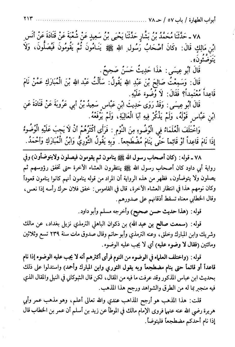 [78] قَوْلُهُ (كَانَ أَصْحَابُ رَسُولِ اللَّهِ صَلَّى اللَّهُ عَلَيْهِ وَسَلَّمَ يَنَامُونَ ثُمَّ يَقُومُونَ فَيُصَلُّونَ وَلَا يتوضؤون) وَفِي رِوَايَةِ أَبِي دَاوُدَ كَانَ أَصْحَابُ رَسُولِ اللَّهِ صَلَّى اللَّهُ عَلَيْهِ وَسَلَّمَ يَنْتَظِرُونَ الْعِشَاءَ الآخرة حتى تخفق رؤوسهم ثم يصلون ولا يتوضؤون فَظَهَرَ مِنْ هَذِهِ الرِّوَايَةِ أَنَّ الْمُرَادَ مِنْ قَوْلِهِ يَنَامُونَ أَنَّهُمْ كَانُوا يَنَامُونَ قُعُودًا وَكَانَ نَوْمُهُمْ هَذَا فِي انْتِظَارِ الْعِشَاءِ الْآخِرَةِ قَالَ فِي الْقَامُوسِ خَفَقَ فُلَانٌ حَرَّكَ رَأْسَهُ إِذَا نَعَسَ وَقَالَ الْخَطَّابِيُّ مَعْنَاهُ تَسْقُطُ أَذْقَانُهُمْ عَلَى صُدُورِهِمْ