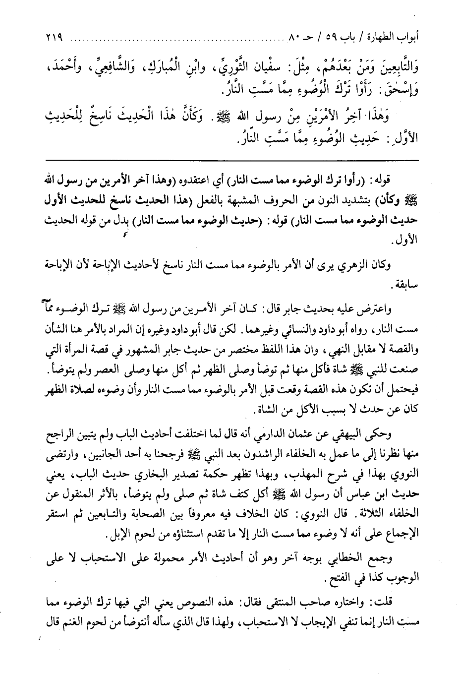 قَوْلُهُ (رَأَوْا تَرْكَ الْوُضُوءِ مِمَّا مَسَّتِ النَّارُ) أَيْ اعْتَقَدُوهُ (وَهَذَا آخِرُ الْأَمْرَيْنِ مِنْ رَسُولِ اللَّهِ صَلَّى اللَّهُ عَلَيْهِ وَسَلَّمَ وَكَأَنَّ) بِتَشْدِيدِ النُّونِ مِنَ الْحُرُوفِ الْمُشَبَّهَةِ بِالْفِعْلِ (هَذَا الْحَدِيثَ نَاسِخٌ لِلْحَدِيثِ الْأَوَّلِ حَدِيثِ الْوُضُوءِ مِمَّا مَسَّتِ النَّارُ) قَوْلُهُ (حَدِيثِ الْوُضُوءِ مِمَّا مَسَّتِ النَّارُ) بَدَلٌ مِنْ قَوْلِهِ الْحَدِيثِ الْأَوَّلِ