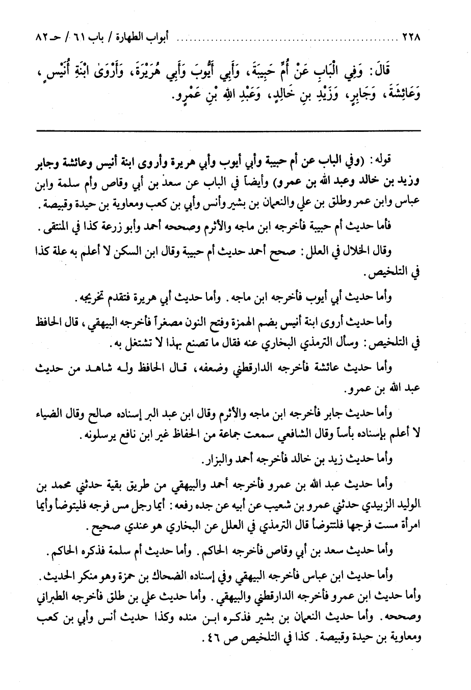 قَوْلُهُ (وَفِي الْبَابِ عَنْ أُمِّ حَبِيبَةَ وَأَبِي أَيُّوبَ وَأَبِي هُرَيْرَةَ وَأَرْوَى ابْنَةَ أُنَيْسٍ وَعَائِشَةَ وَجَابِرٍ وَزَيْدِ بْنِ خَالِدٍ وَعَبْدِ اللَّهِ بْنِ عَمْرٍو) وَأَيْضًا فِي الْبَابِ عَنْ سَعْدِ بْنِ أبي وقاص وأم سلمة وبن عباس وبن عُمَرَ وَطَلْقِ بْنِ عَلِيٍّ وَالنُّعْمَانِ بْنِ بَشِيرٍ وَأَنَسٍ وَأُبَيِّ بْنِ كَعْبٍ وَمُعَاوِيَةَ بْنِ حَيْدَةَ وقبيصة