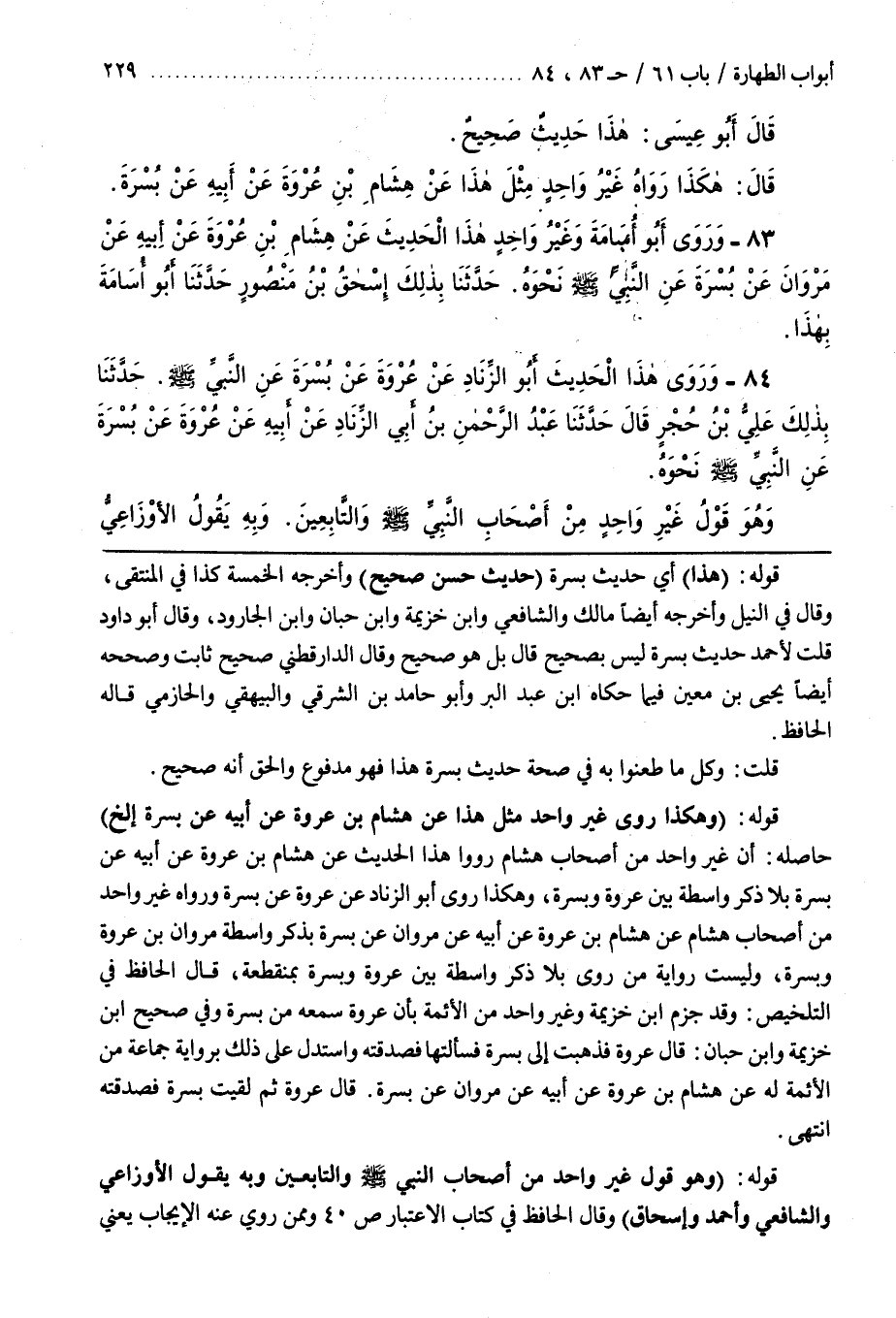 قَوْلُهُ (وَهَكَذَا رَوَى غَيْرُ وَاحِدٍ مِثْلَ هَذَا عَنْ هِشَامِ بْنِ عُرْوَةَ عَنْ أَبِيهِ عَنْ بُسْرَةَ إِلَخْ) حَاصِلُهُ أَنَّ غَيْرَ وَاحِدٍ مِنْ أَصْحَابِ هِشَامٍ رَوَوْا هَذَا الْحَدِيثَ عَنْ هِشَامِ بْنِ عُرْوَةَ عَنْ أَبِيهِ عَنْ بُسْرَةَ بِلَا ذِكْرِ وَاسِطَةٍ بَيْنَ عُرْوَةَ وَبُسْرَةَ وَهَكَذَا رَوَى أَبُو الزِّنَادِ عَنْ عُرْوَةَ عَنْ بُسْرَةَ وَرَوَاهُ غَيْرُ وَاحِدٍ مِنْ أَصْحَابِ هِشَامٍ عَنْ هِشَامِ بْنِ عُرْوَةَ عَنْ أَبِيهِ عَنْ مَرْوَانَ عَنْ بُسْرَةَ بِذِكْرِ وَاسِطَةِ مَرْوَانَ بْنِ عُرْوَةَ وَبُسْرَةَ وَلَيْسَتْ رِوَايَةُ مَنْ رَوَى بِلَا ذِكْرِ وَاسِطَةٍ بَيْنَ عُرْوَةَ وَبُسْرَةَ بِمُنْقَطِعَةٍ قَالَ الْحَافِظُ فِي التَّلْخِيصِ وَقَدْ جَزَمَ بن خُزَيْمَةَ وَغَيْرُ وَاحِدٍ مِنَ الْأَئِمَّةِ بِأَنَّ عُرْوَةَ سمعه من بسرة وفي صحيح بن خزيمة وبن حِبَّانَ قَالَ عُرْوَةُ فَذَهَبْتُ إِلَى بُسْرَةَ فَسَأَلْتُهَا فَصَدَّقَتْهُ وَاسْتَدَلَّ عَلَى ذَلِكَ بِرِوَايَةِ جَمَاعَةٍ مِنَ الْأَئِمَّةِ لَهُ عَنْ هِشَامِ بْنِ عُرْوَةَ عَنْ أَبِيهِ عَنْ مَرْوَانَ عَنْ بُسْرَةَ