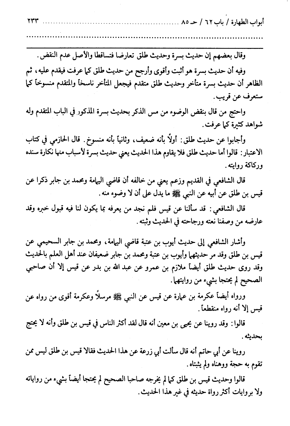 قَالَ الْحَازِمِيُّ فِي كِتَابِ الِاعْتِبَارِ قَالُوا أَمَّا حَدِيثُ طَلْقٍ فَلَا يُقَاوِمُ هَذَا الْحَدِيثَ يَعْنِي حَدِيثَ بُسْرَةَ لِأَسْبَابٍ مِنْهَا نَكَارَةُ سَنَدِهِ وَرَكَاكَةُ رِوَايَتِهِ