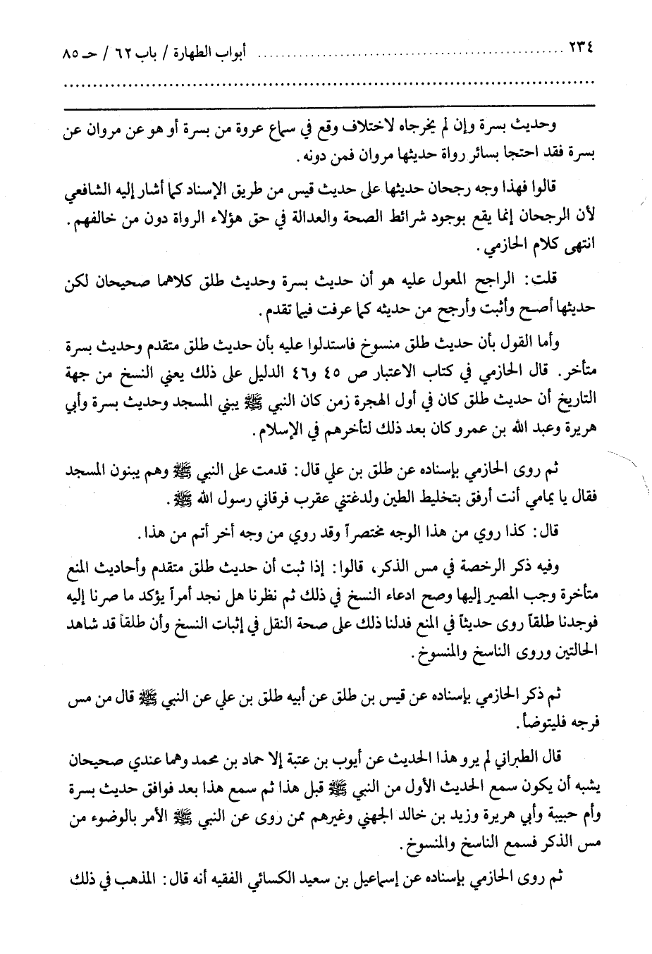 قَالَ الْحَازِمِيُّ فِي كِتَابِ الِاعْتِبَارِ ص 54 و64 الدَّلِيلُ عَلَى ذَلِكَ يَعْنِي النَّسْخَ مِنْ جِهَةِ التَّارِيخِ أَنَّ حَدِيثَ طَلْقٍ كَانَ فِي أَوَّلِ الْهِجْرَةِ زَمَنَ كَانَ النَّبِيُّ صَلَّى اللَّهُ عَلَيْهِ وَسَلَّمَ يَبْنِي الْمَسْجِدَ وَحَدِيثَ بُسْرَةَ وَأَبِي هُرَيْرَةَ وَعَبْدِ اللَّهِ بْنِ عَمْرٍو كَانَ بَعْدَ ذَلِكَ لِتَأَخُّرِهِمْ فِي الْإِسْلَامِ