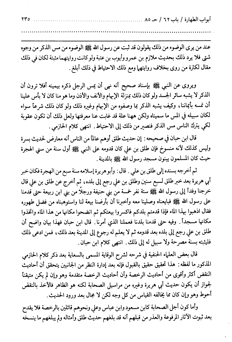 قال بن حِبَّانَ فِي صَحِيحِهِ إِنَّ حَدِيثَ طَلْقٍ أَوْهَمَ عَالَمًا مِنَ النَّاسِ أَنَّهُ مُعَارِضٌ لِحَدِيثِ بُسْرَةَ وَلَيْسَ كَذَلِكَ لِأَنَّهُ مَنْسُوخٌ فَإِنَّ طَلْقَ بْنَ عَلِيٍّ كَانَ قُدُومُهُ عَلَى النَّبِيِّ صَلَّى اللَّهُ عَلَيْهِ وَسَلَّمَ أَوَّلَ سَنَةٍ مِنْ سِنِي الْهِجْرَةِ حَيْثُ كَانَ الْمُسْلِمُونَ يَبْنُونَ مَسْجِدَ رَسُولِ اللَّهِ صَلَّى اللَّهُ عَلَيْهِ وَسَلَّمَ بِالْمَدِينَةِ