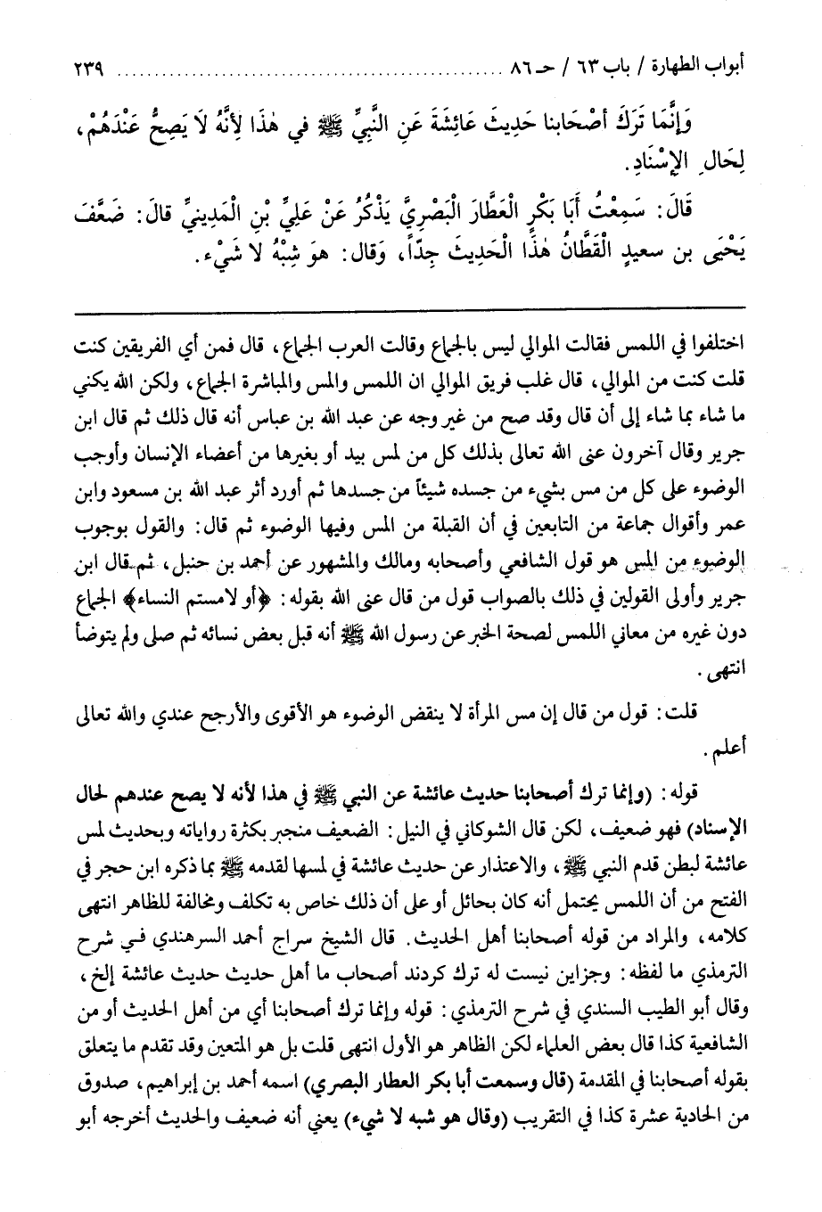 قَوْلُهُ (وَإِنَّمَا تَرَكَ أَصْحَابُنَا حَدِيثَ عَائِشَةَ عَنِ النَّبِيِّ صَلَّى اللَّهُ عَلَيْهِ وَسَلَّمَ فِي هَذَا لِأَنَّهُ لَا يَصِحُّ عِنْدَهُمْ لِحَالِ الْإِسْنَادِ) فَهُوَ ضَعِيفٌ لَكِنْ قَالَ الشَّوْكَانِيُّ فِي النَّيْلِ الضَّعِيفُ مُنْجَبِرٌ بِكَثْرَةِ رِوَايَاتِهِ وَبِحَدِيثِ لَمْسِ عَائِشَةَ لِبَطْنِ قَدَمِ النَّبِيِّ صَلَّى اللَّهُ عَلَيْهِ وَسَلَّمَ وَالِاعْتِذَارُ عَنْ حَدِيثِ عَائِشَةَ فِي لَمْسِهَا لِقَدَمِهِ صَلَّى الله عليه وسلم بما ذكره بن حَجَرٍ فِي الْفَتْحِ مِنْ أَنَّ اللَّمْسَ يُحْتَمَلُ أَنَّهُ كَانَ بِحَائِلٍ أَوْ عَلَى أَنَّ ذَلِكَ خَاصٌّ بِهِ تَكَلُّفٌ وَمُخَالَفَةٌ لِلظَّاهِرِ انْتَهَى كَلَامُهُ وَالْمُرَادُ مِنْ قَوْلِهِ أَصْحَابُنَا أَهْلُ الْحَدِيثِ